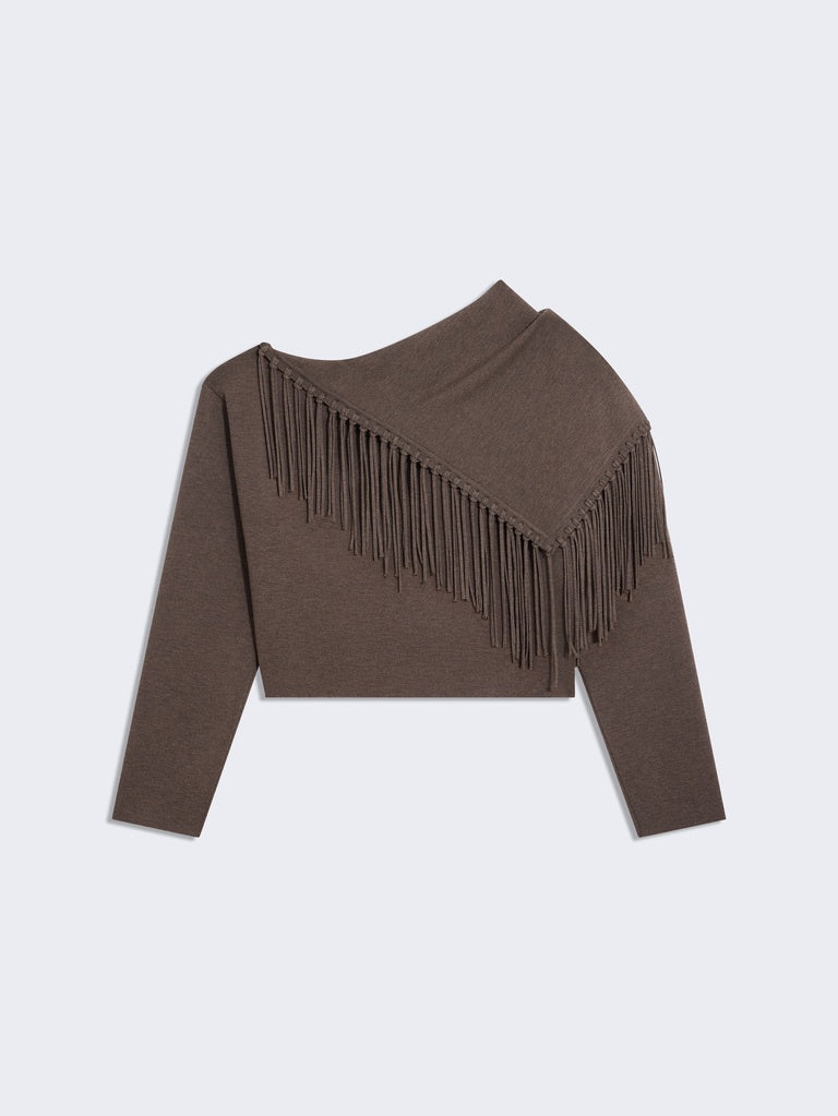This long-sleeved sweater is knitted in brown virgin wool. It features a wide, asymmetrical, fringed turn-down collar and a signature gold-tone metal keyhole rivet at the back.