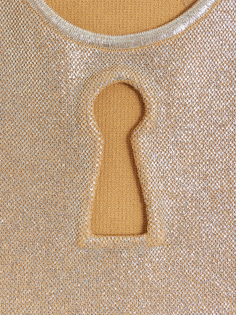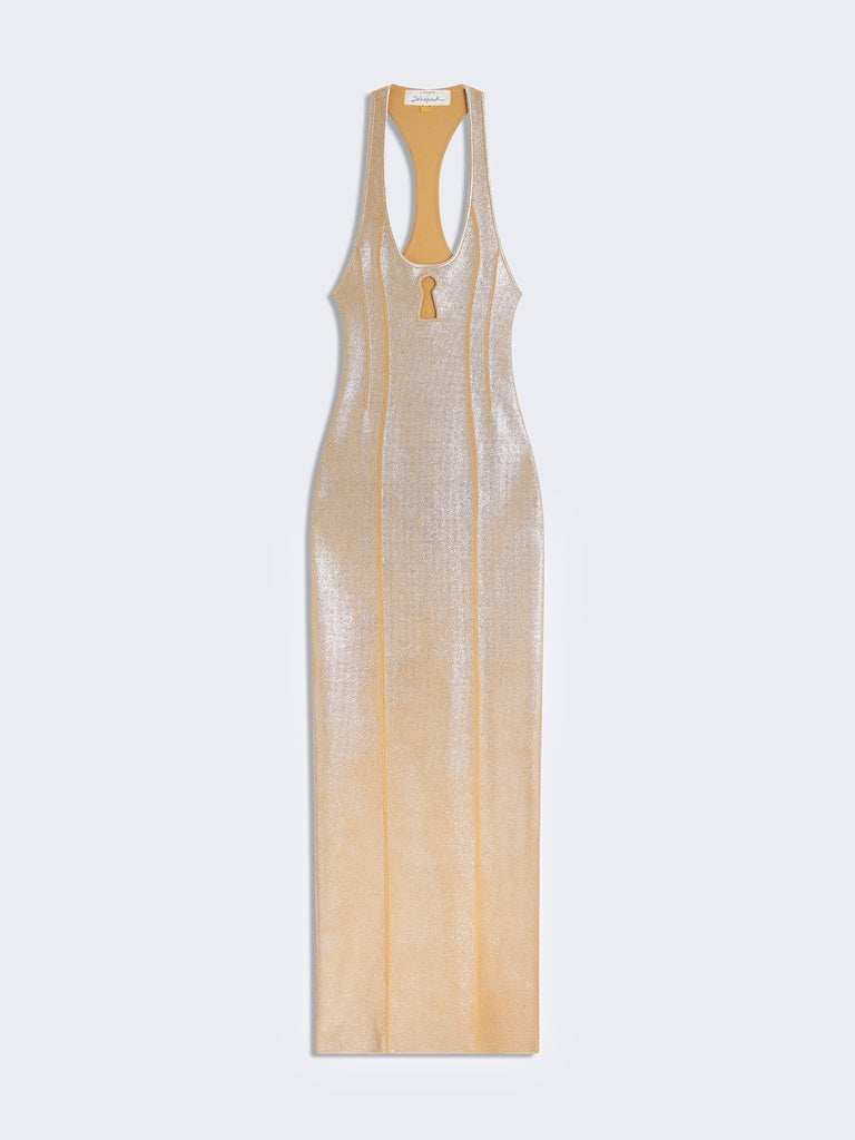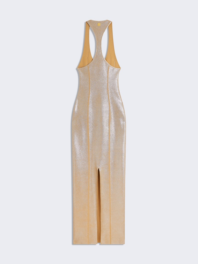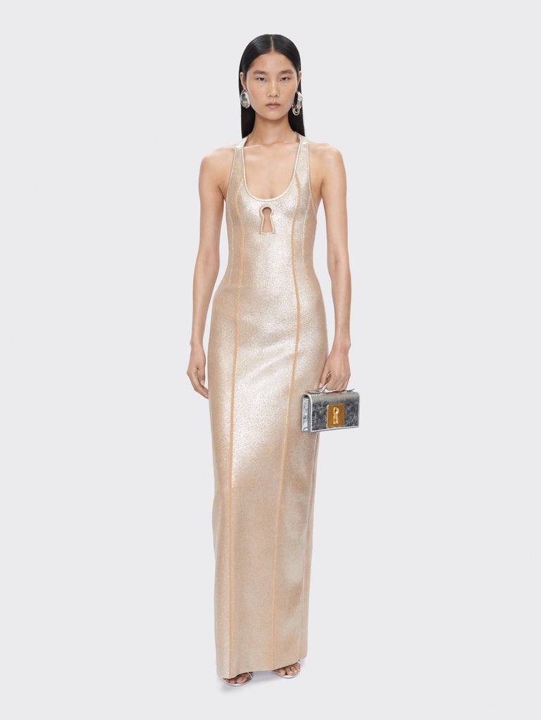 This long, fitted dress is crafted from a nude viscose piqué knit with sheer lamination. Featuring a rounded neckline and racerback, it is finished with a signature keyhole cutout at the front.