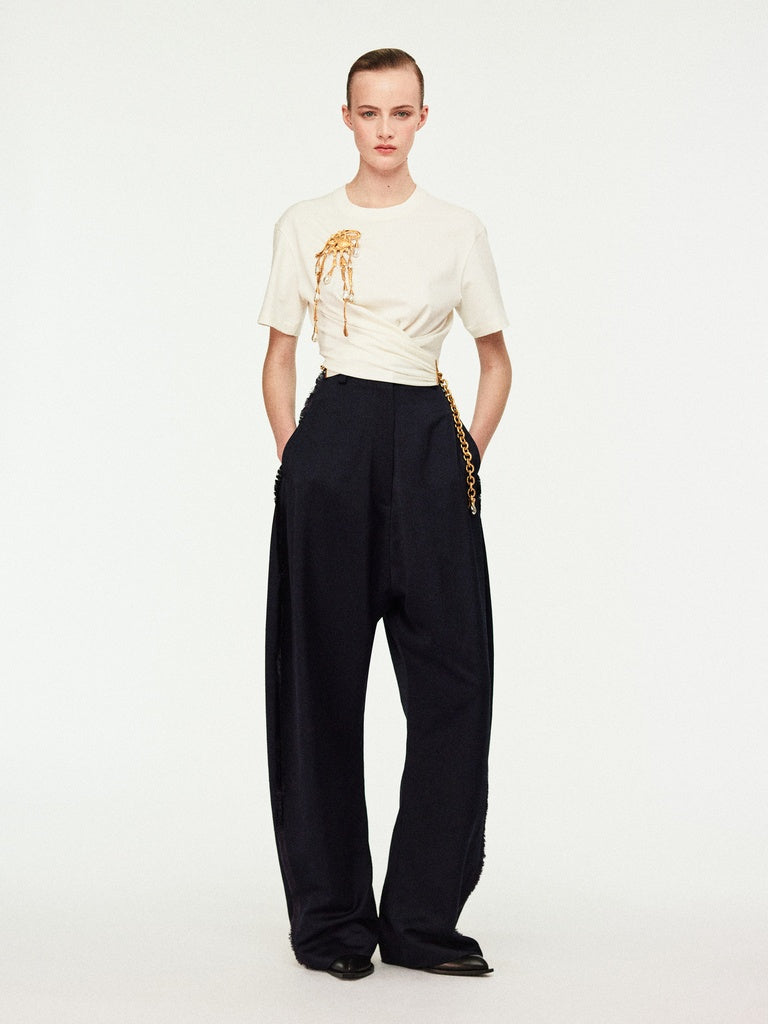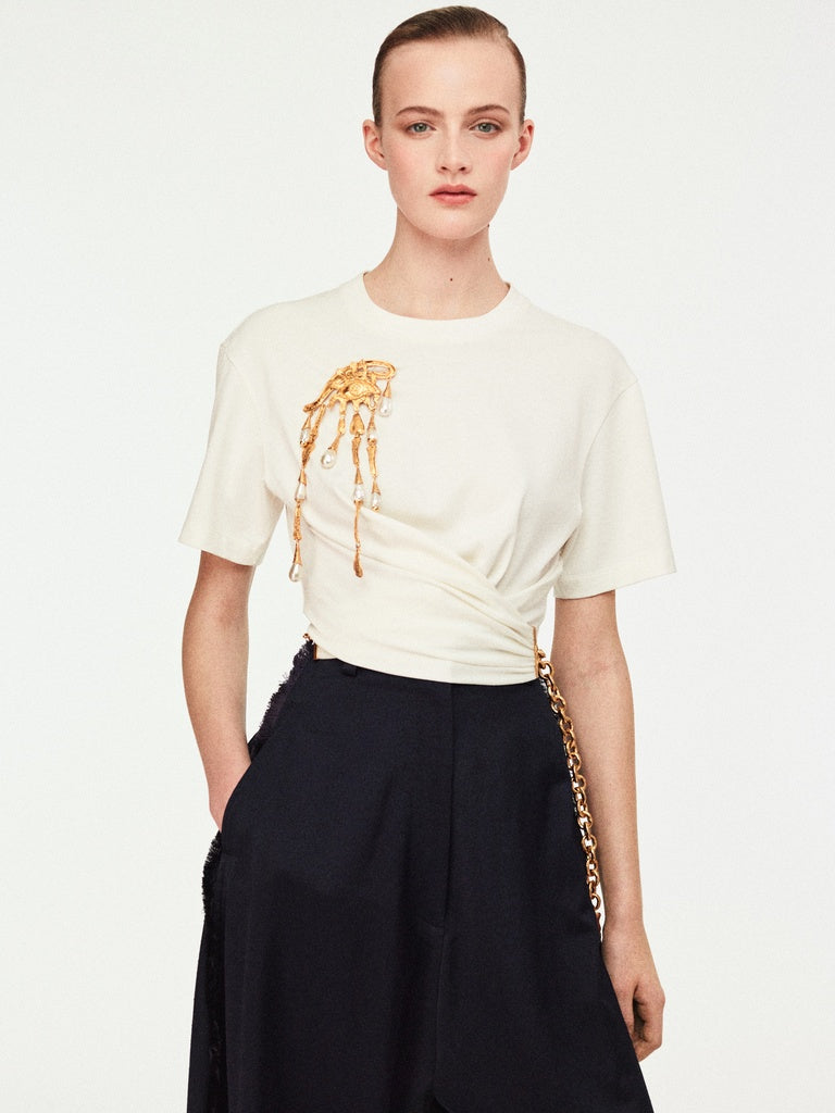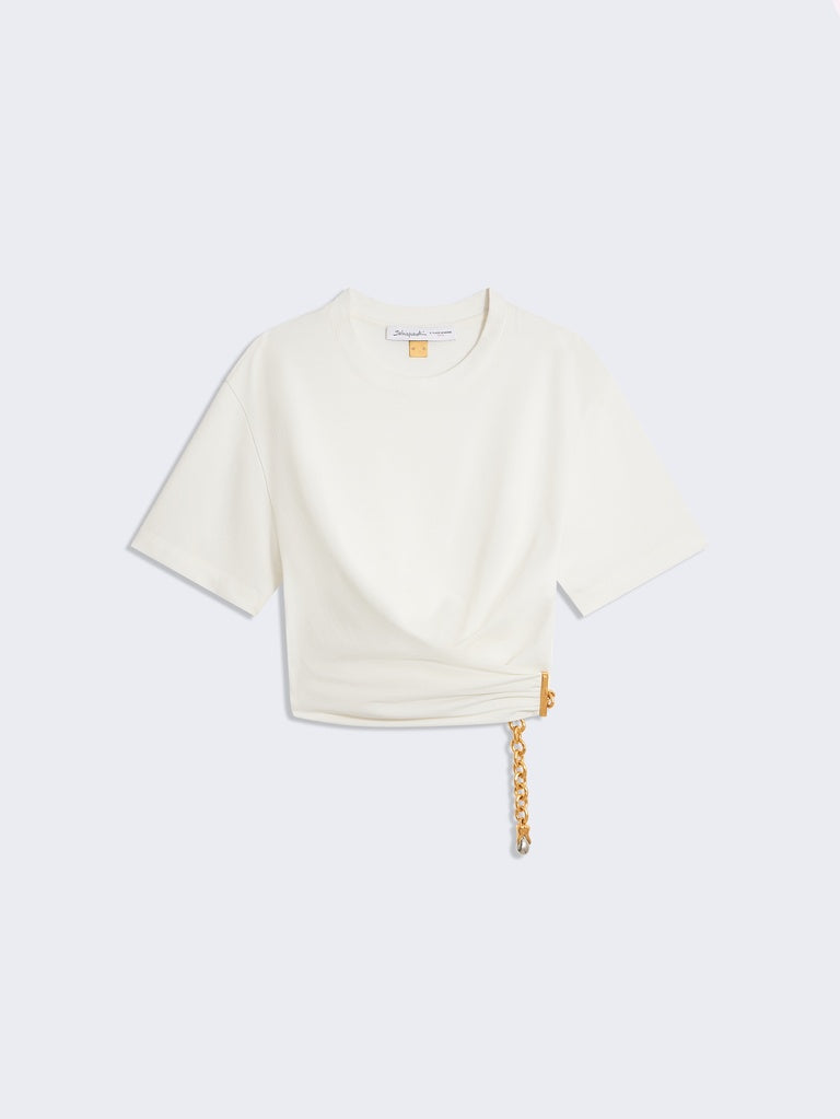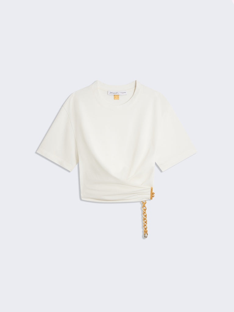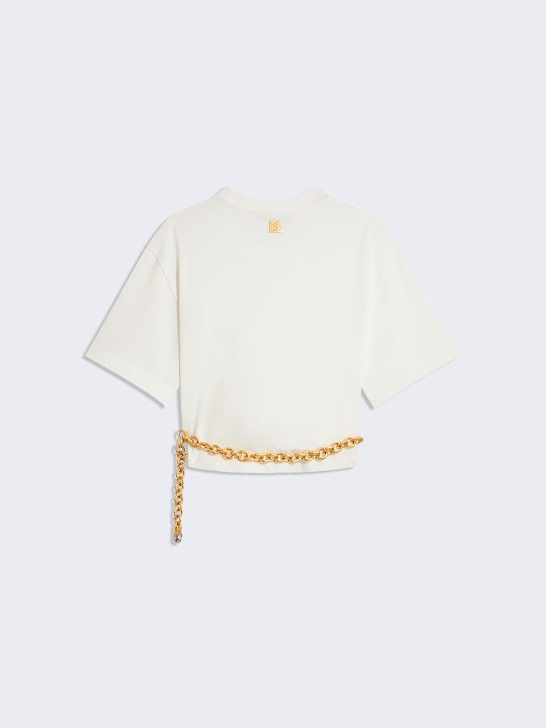 This white cotton, short-sleeved, crew-neck T-shirt features a twisted cut and is held together by a gold-tone metal chain at the side. It is embellished with a signature gold-tone metal keyhole rivet at the back.