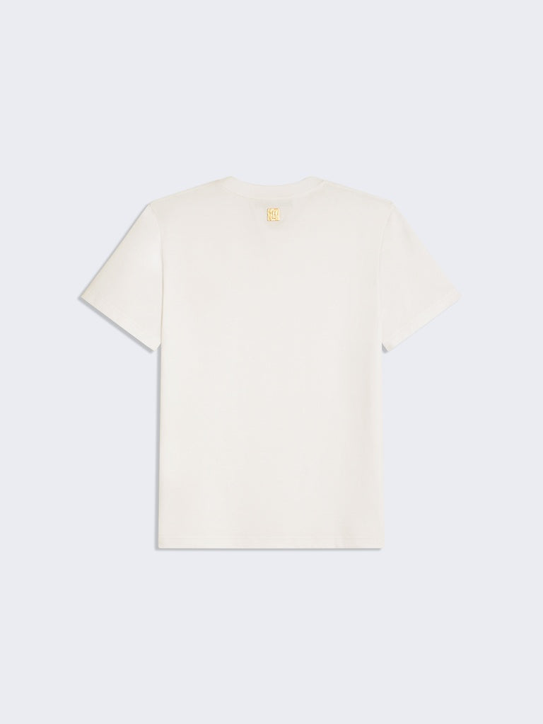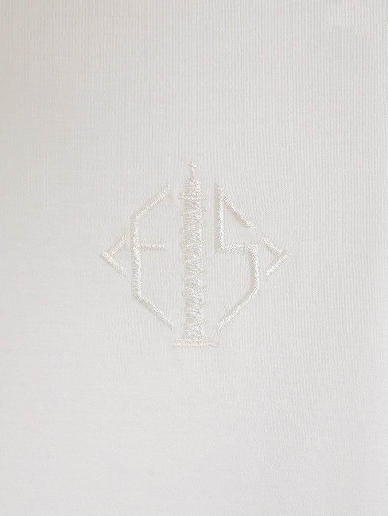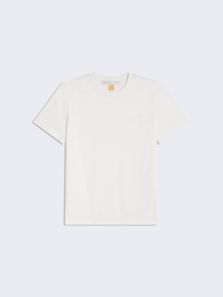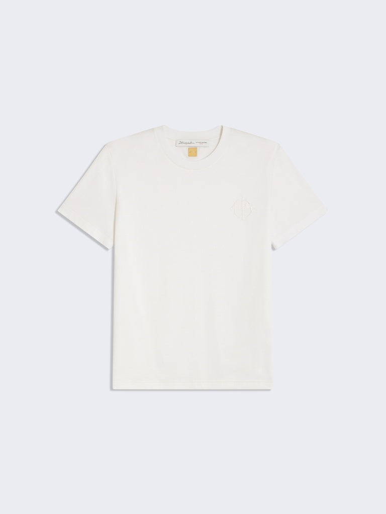 This short-sleeved, crew-neck T-shirt is made from white cotton jersey. It features a tone-on-tone embroidered monogram on the left chest and a signature keyhole rivet on the back.