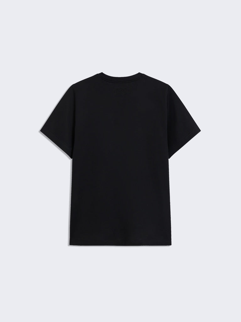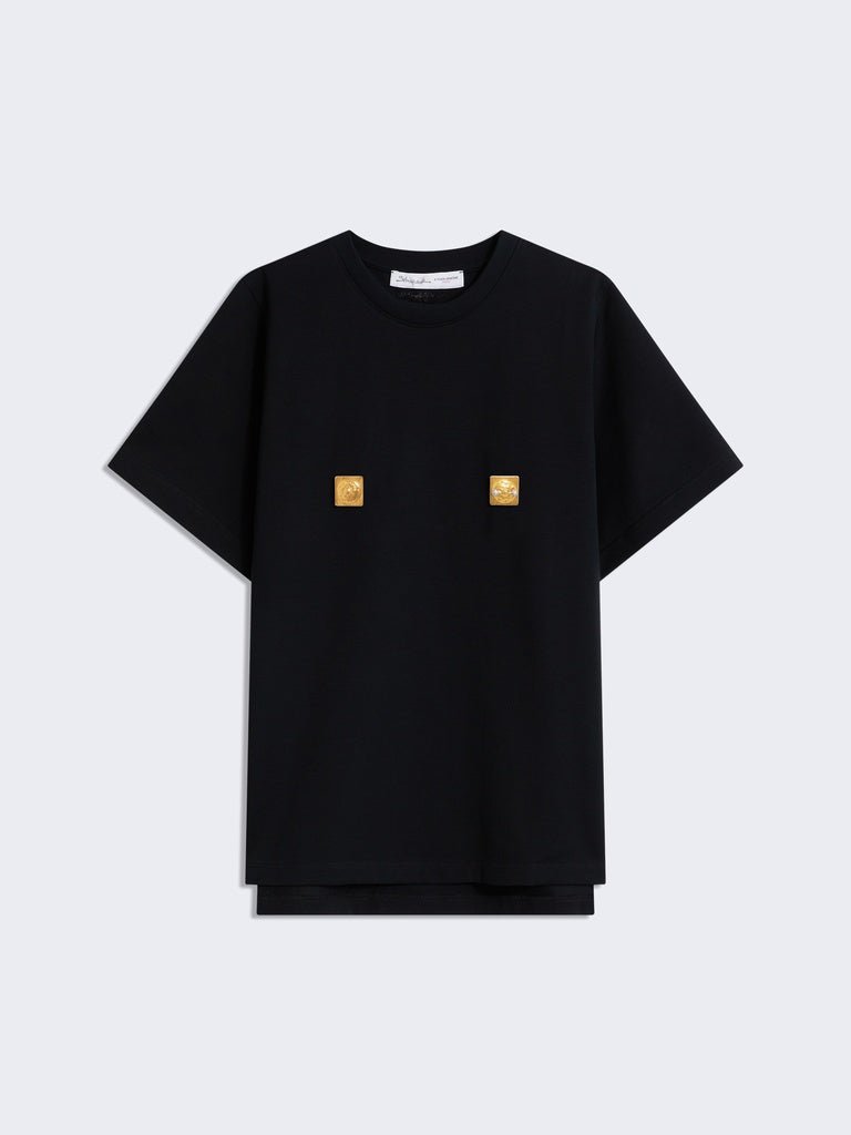 Black cotton T-shirt, embellished with gold nipple jewel buttons.