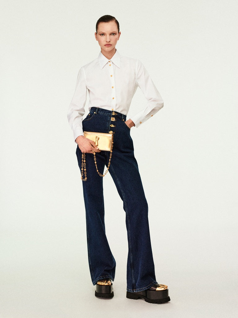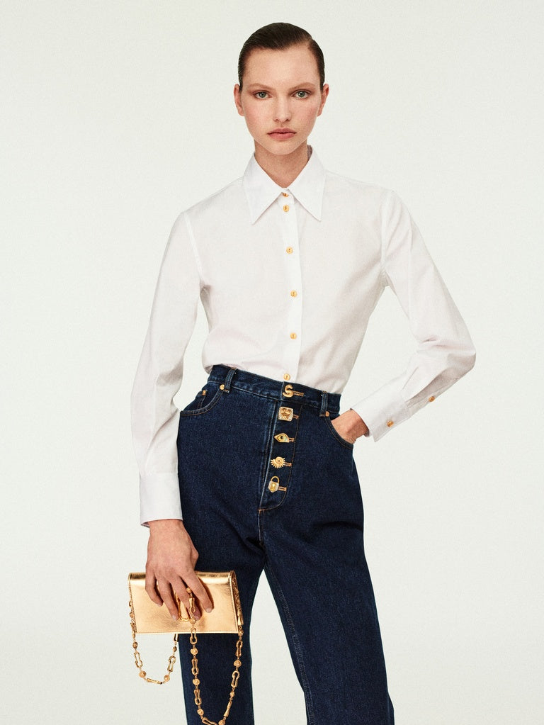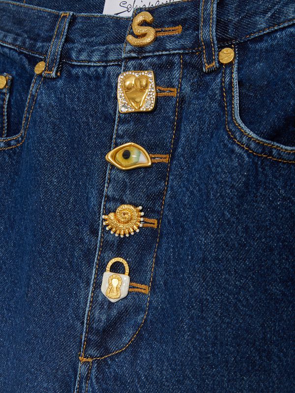 It is illuminated with gold accents, such as gold S logo rivets and a row of signature jewel buttons that closes the front.