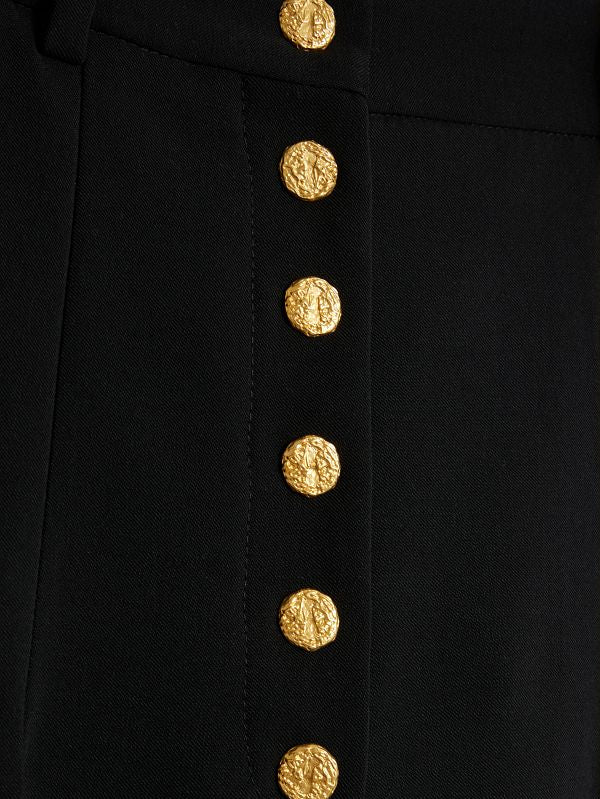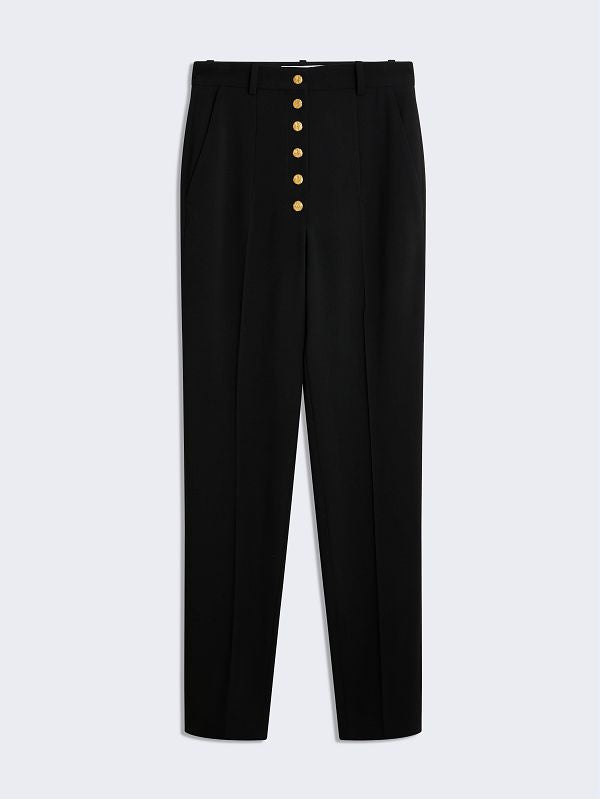 It features a high waist accentuated by tapered legs designed with a marked crease.