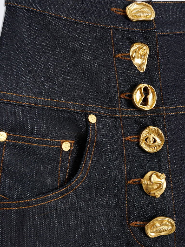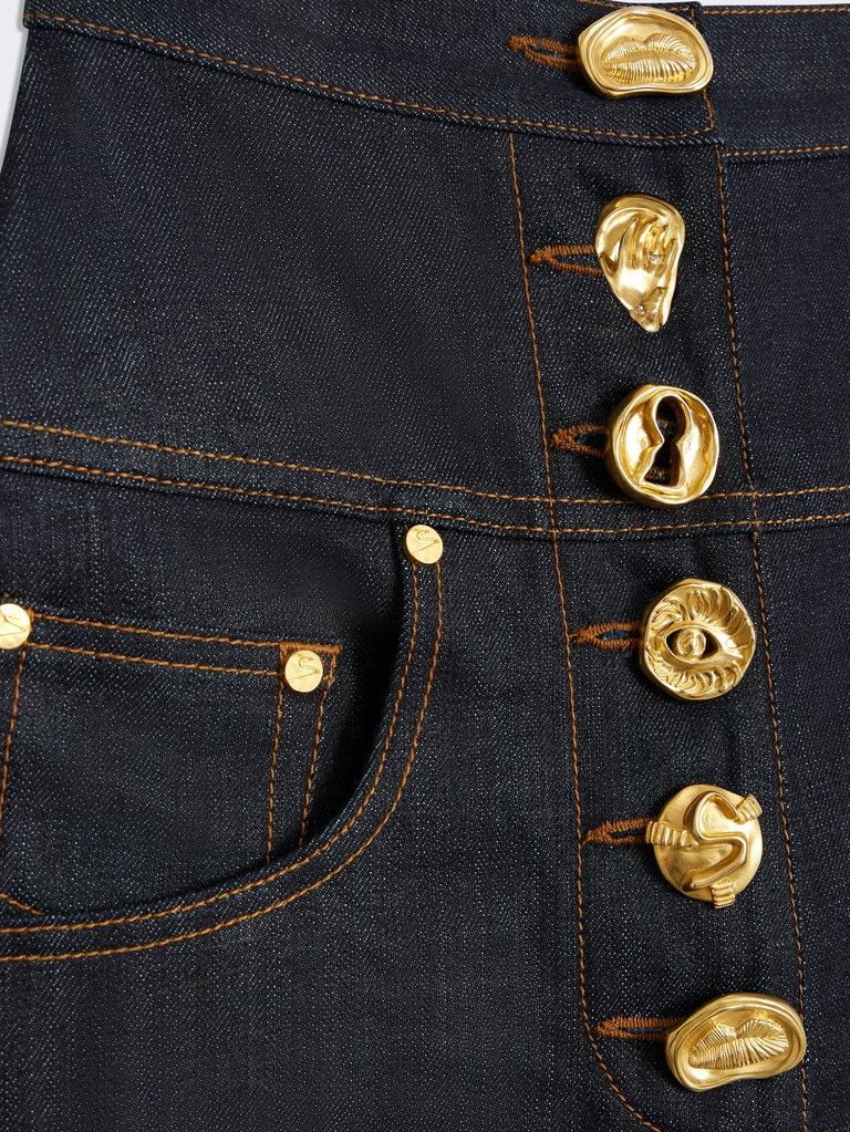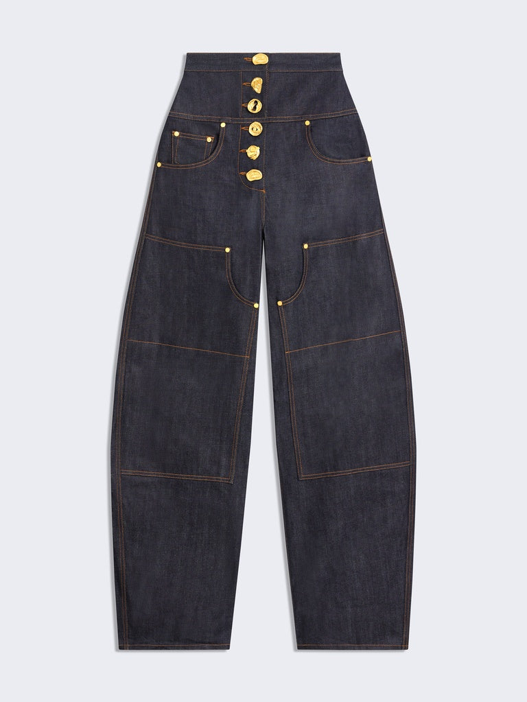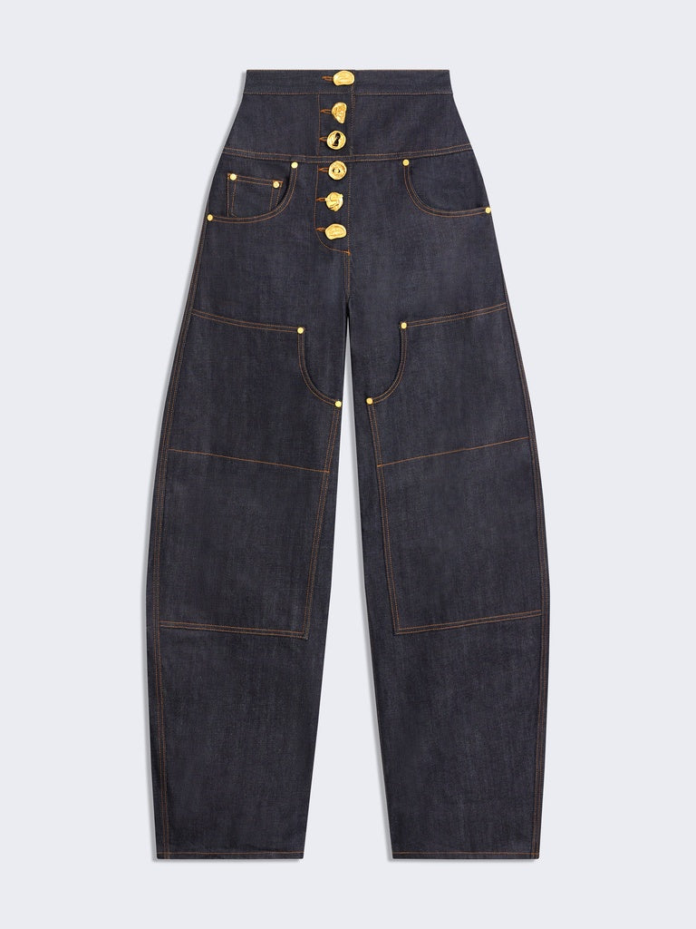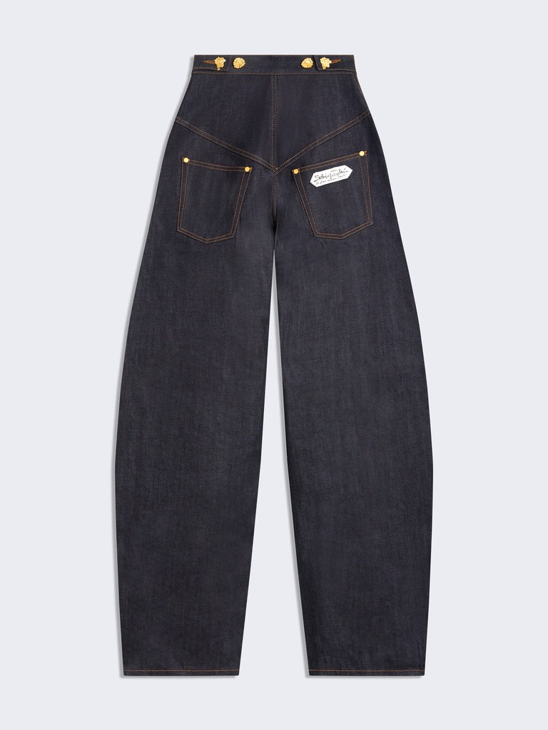 These cowboy trousers are crafted from raw Japanese denim enhanced with tobacco-colored topstitching and cut-out details. Their extra-wide fit is distinguished by tone-on-tone patches on the front. The trousers feature slit pockets and a ticket pocket on the sides, and a row of hammered gold-tone brass jewel buttons. The back is embroidered with a Schiaparelli leather patch and an adjustable tab for a customized waist. This piece can be worn with the matching jacket.
