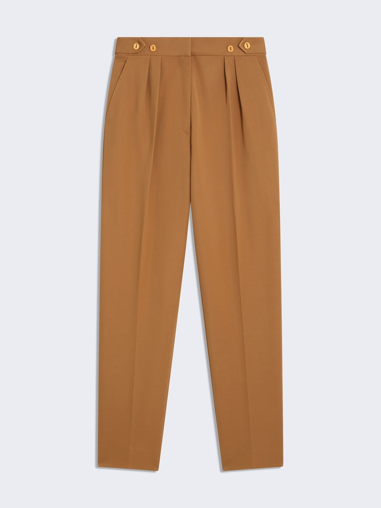 These pleated cigarette trousers with a high waist are made of hazelnut cupro. They are embellished with hammered gold brass jewel buttons at the waistband and on the back pockets.