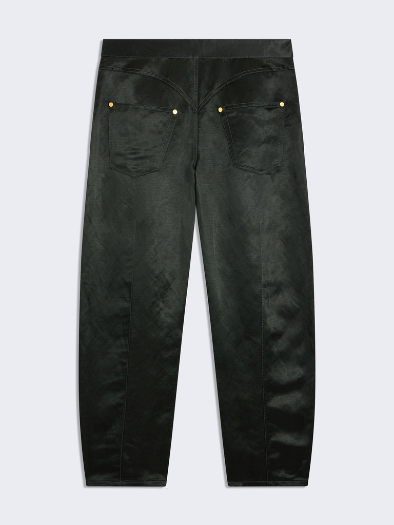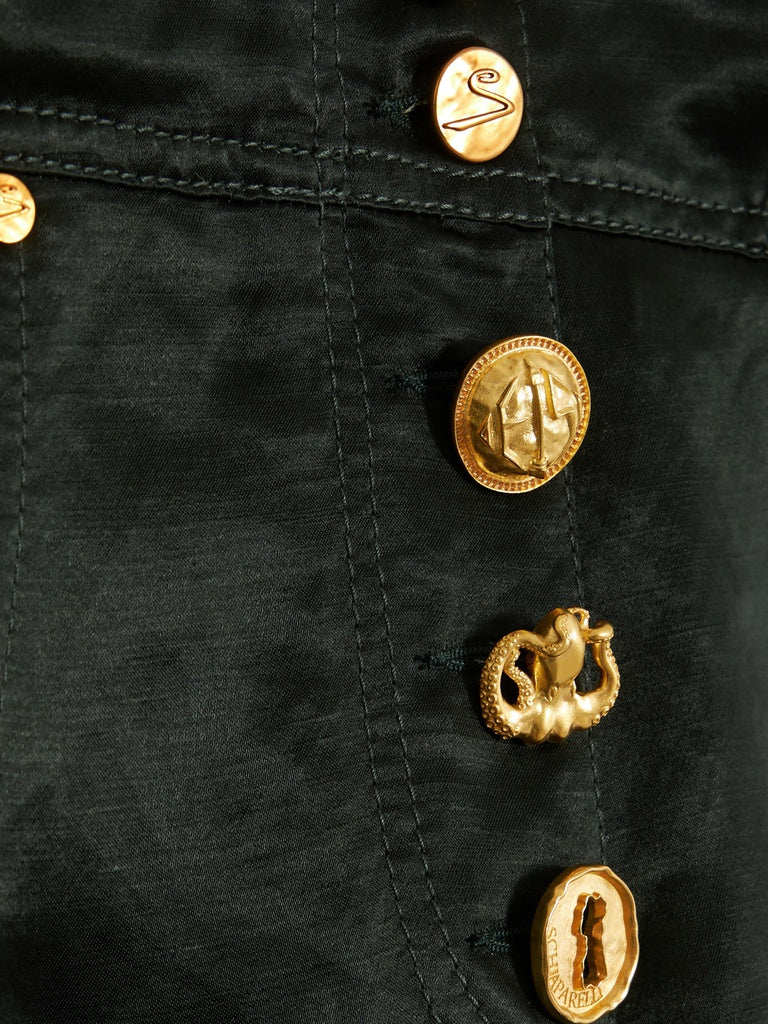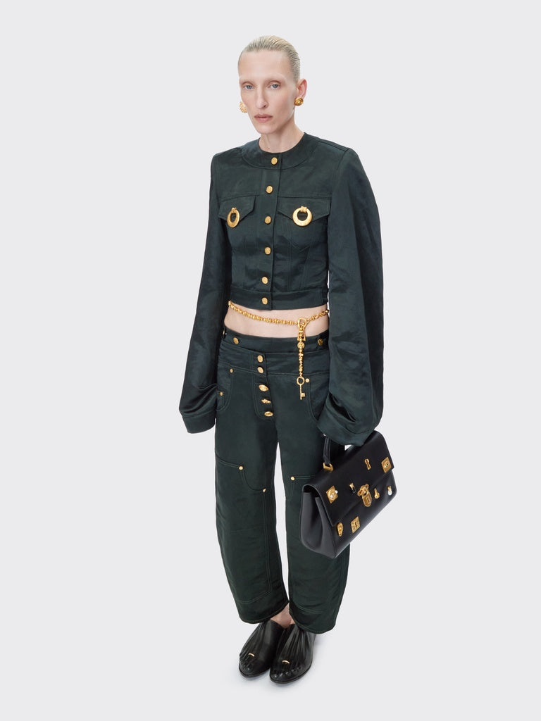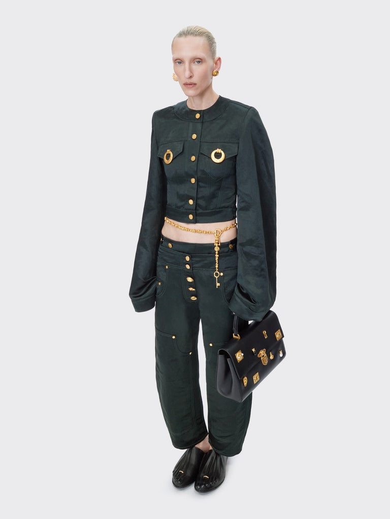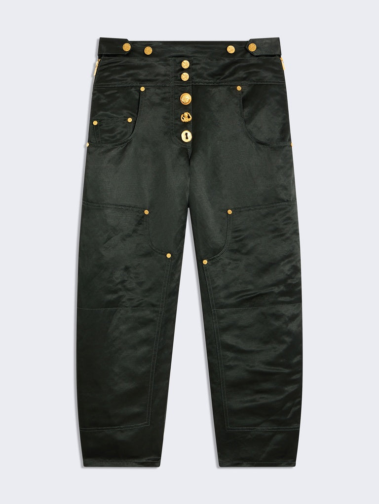 A House classic, these low-rise cowboy trousers are crafted from dark green viscose and linen. They are embellished with numerous iconic Schiaparelli denim details, such as tone-on-tone patches on the front, topstitching, denim buttons, side zips, and hammered gold-tone brass jewel buttons.