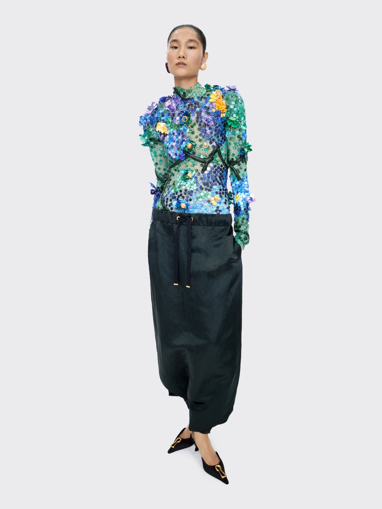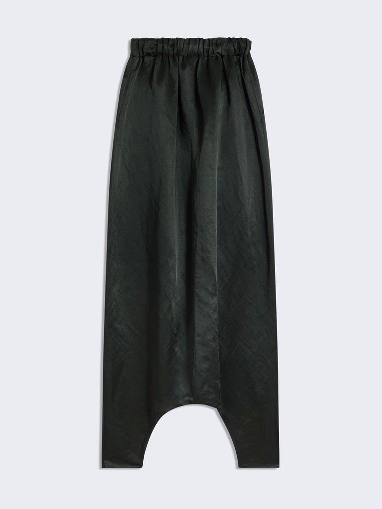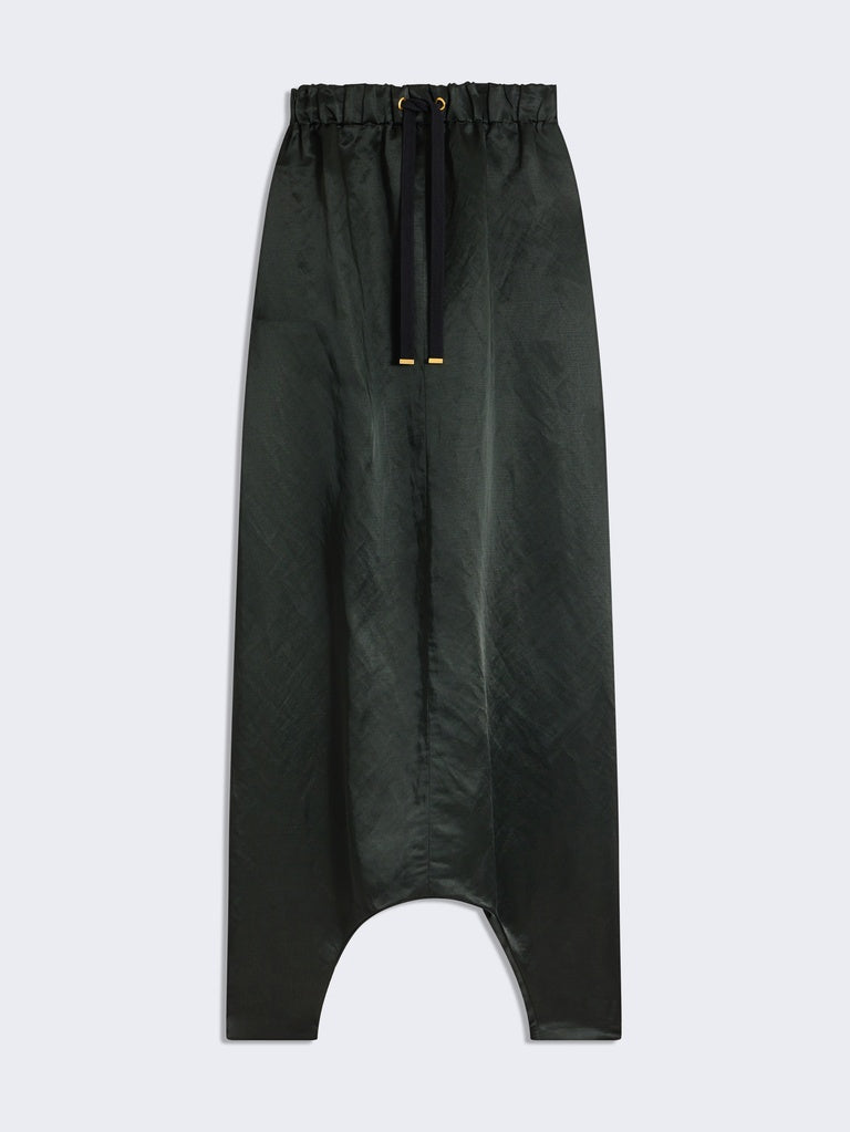 These harem pants are made from a dark green viscose and linen blend. Their ultra-low crotch and puffy waistband are held in place by drawstrings with gold-tone metal tips.