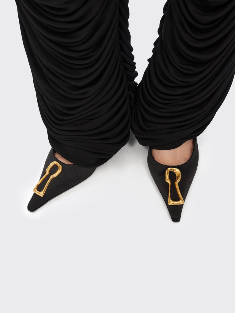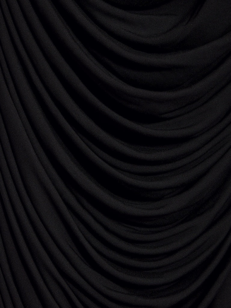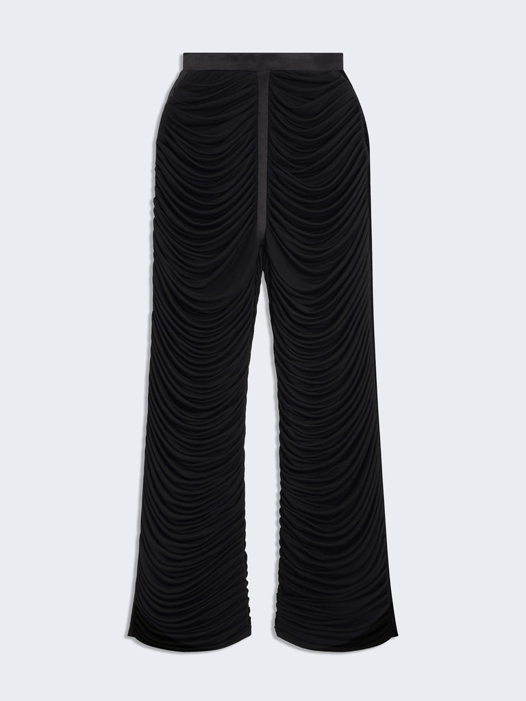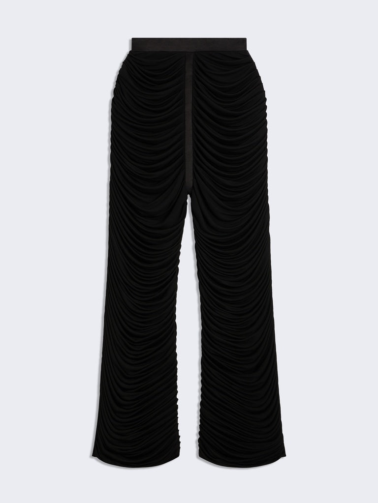 These ultra-stretch black jersey pants are held at the crotch, then in pleats falling all the way down the leg.