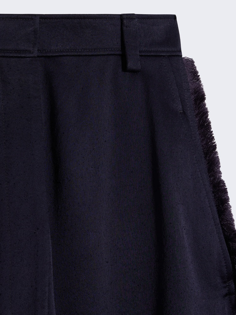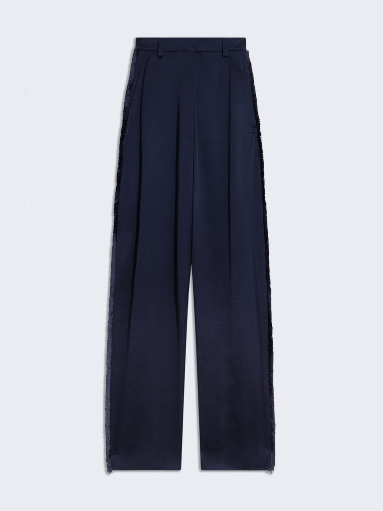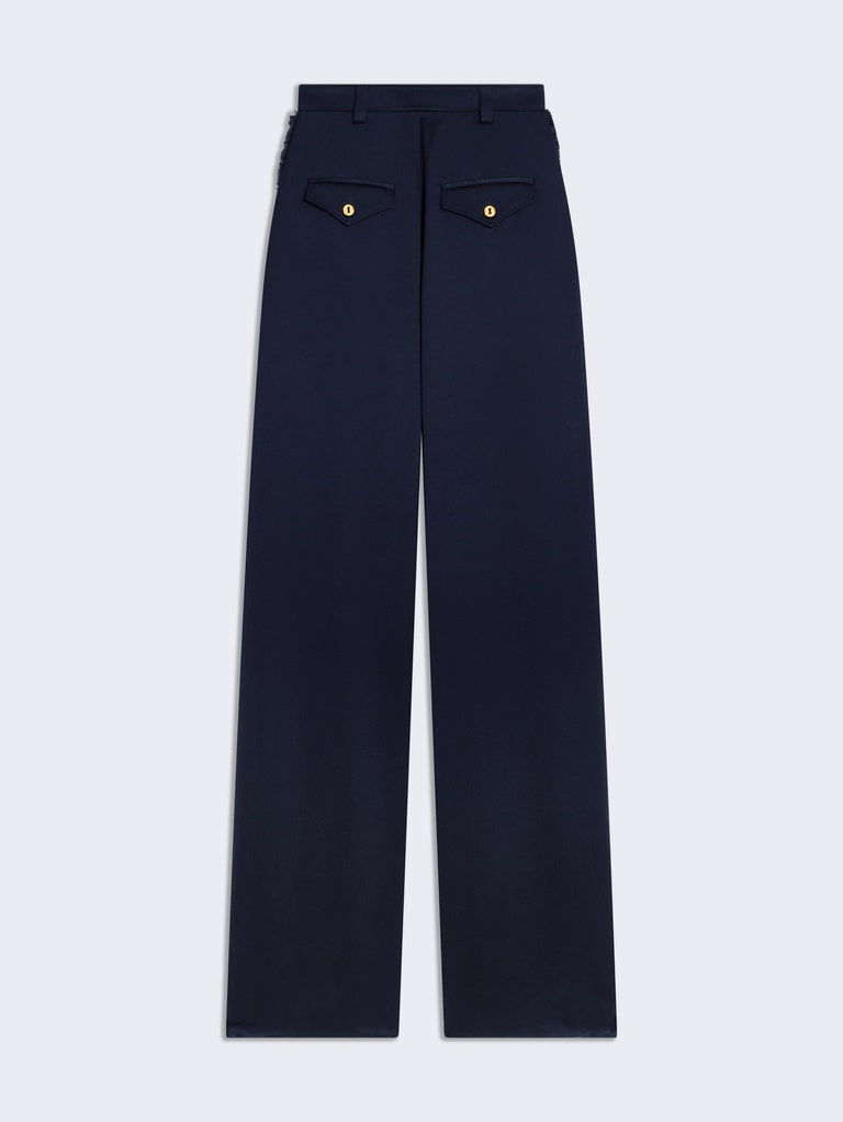 These flowing navy textured satin trousers feature a wide leg and a low crotch. They are finished with signature gold-tone metal Trou de Serrure buttons on the back pockets.