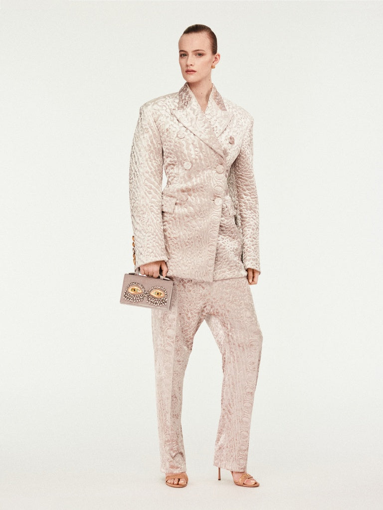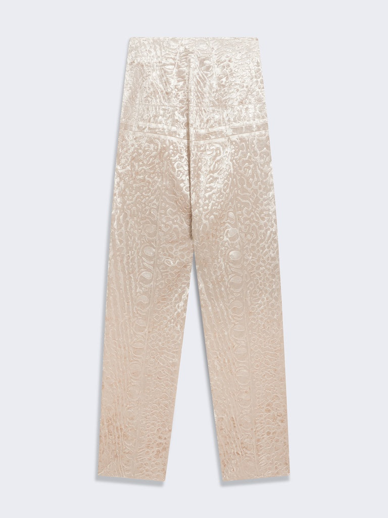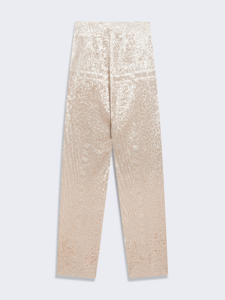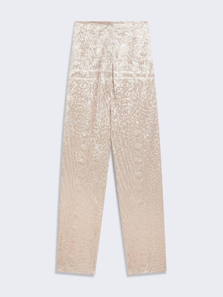 These champagne-colored fluid velvet trousers embossed with a feather motif feature a flowing leg and a very low crotch.