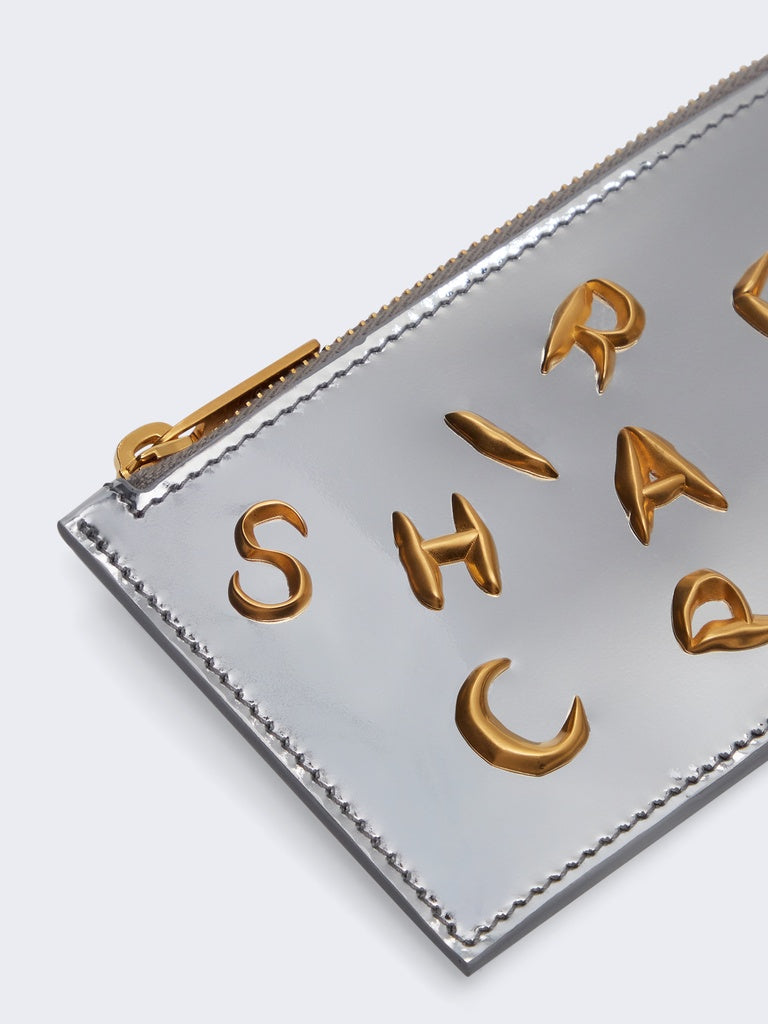 The front is decorated with hammered gold metal letters of the name Schiaparelli; the back is structured by six card slots.
