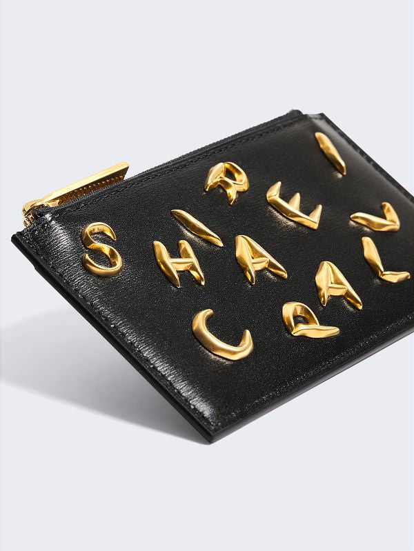 The front is decorated with hammered gold metal letters of the name Schiaparelli; the back is structured by six card slots.