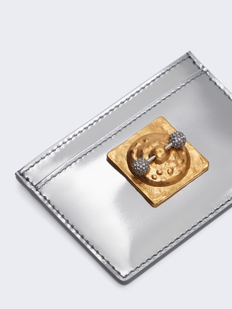 This card holder in calfskin leather with a silver lambskin interior is decorated with the House's iconic nipple detail in tone-on-tone hammered gilt brass.