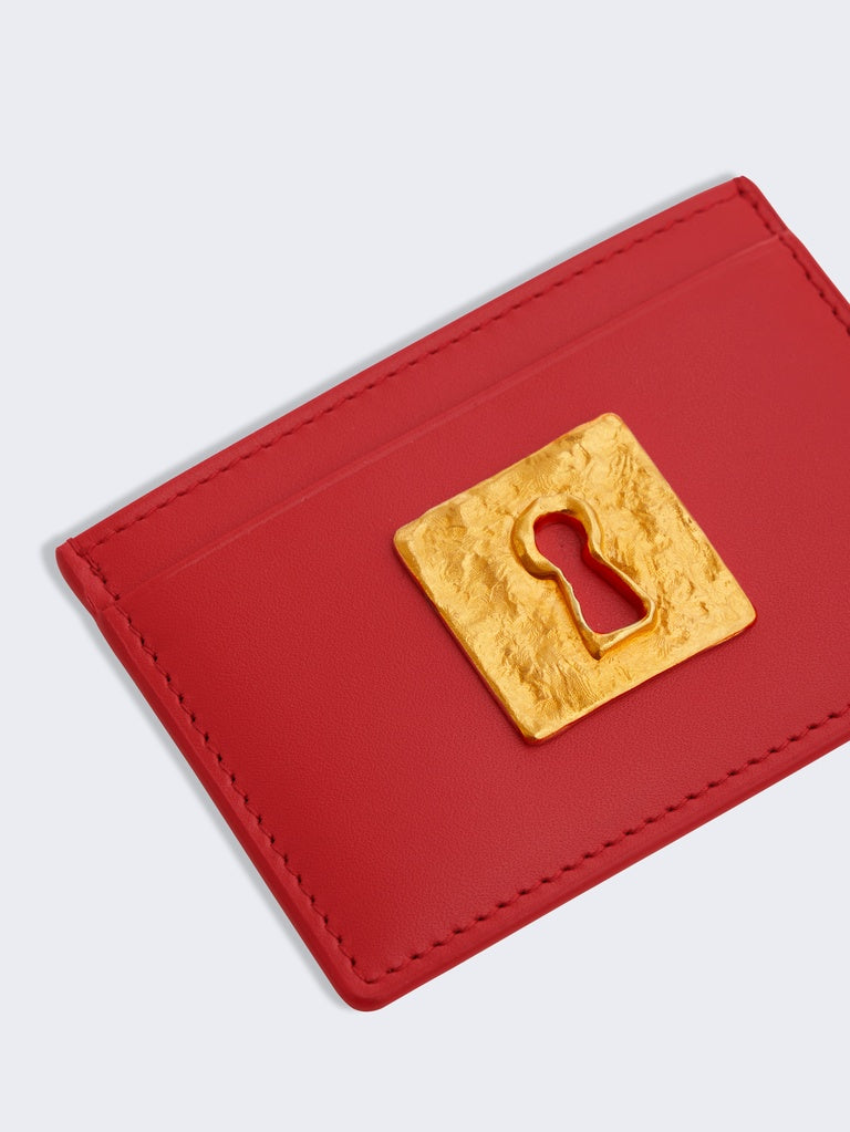 This card holder in calfskin leather with a red lambskin interior is decorated with the House's iconic lock jewel in hammered gilt brass.