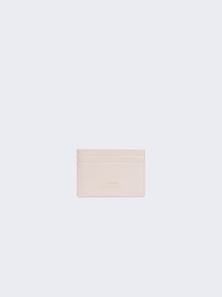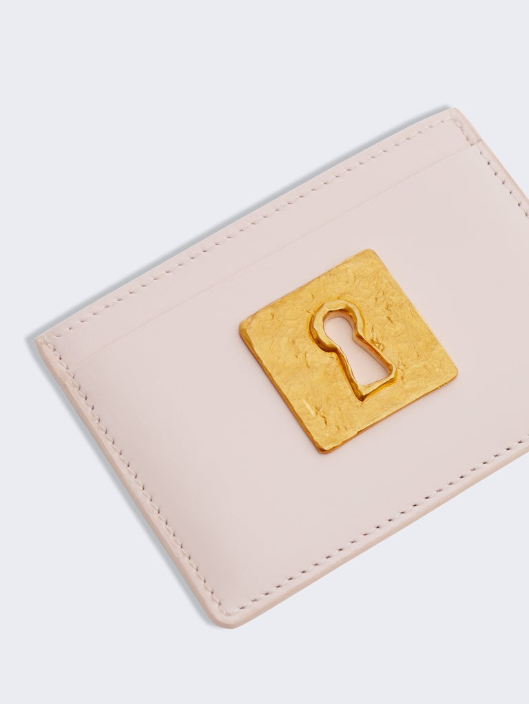 This card holder in calfskin leather and pale pink lambskin leather interior is decorated with the House's iconic lock jewel in hammered gilt brass.