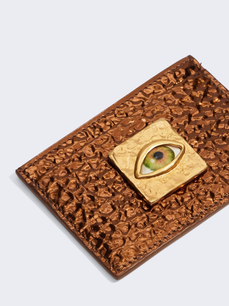 This card holder is crafted from hammered-effect gold laminated calfskin leather. It is adorned with a tone-on-tone metal signature Eye jewel plaque.
