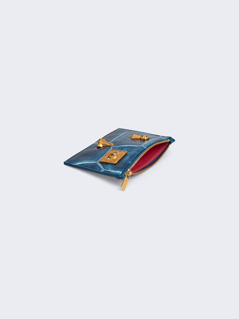Blue calfskin leather coin purse with crocodile effect embossing, adorned with gold brass Anatomy jewelry: a Nose, an Eye, a Lock.