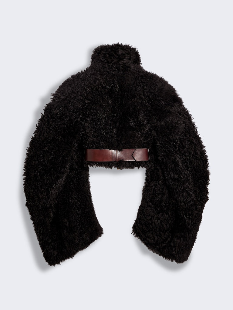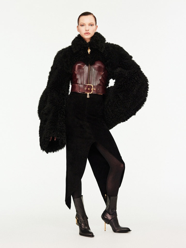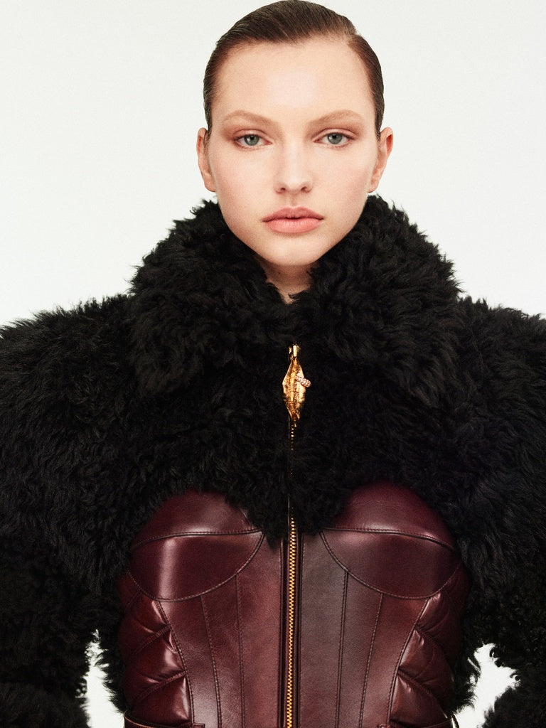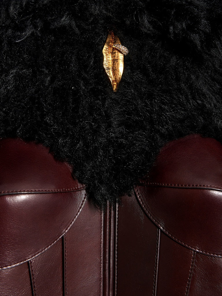 This short-cut, black lambskin shearling zip-up bomber jacket features an integrated corset-inspired bustier in contrasting burgundy calfskin. It's finished with a trucker collar, wide, exaggeratedly long sleeves, and a double-slider zip with a signature gold-tone metal Bouche pull at the center front.