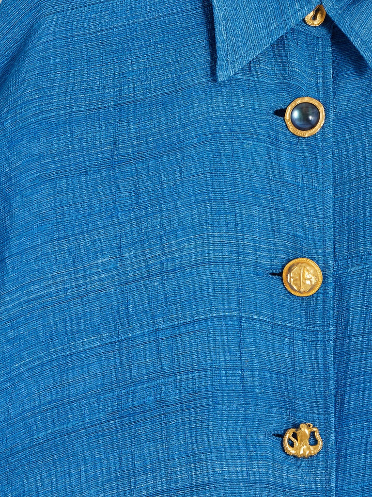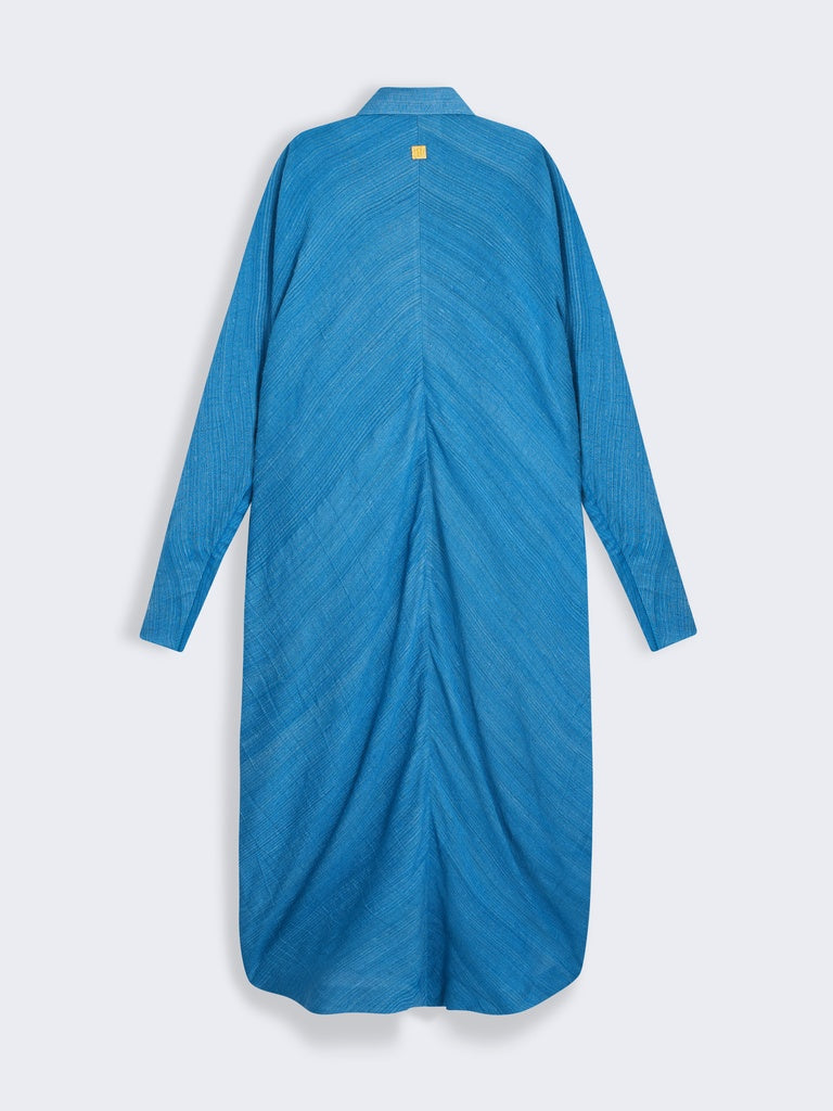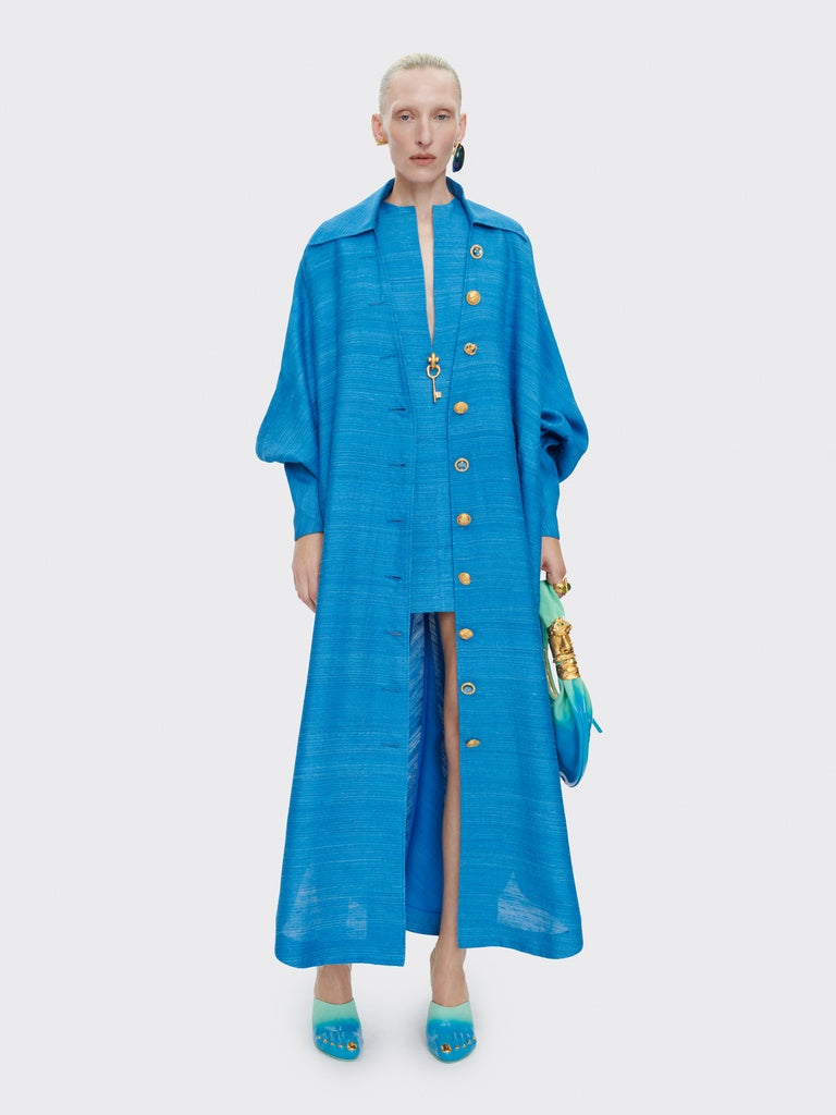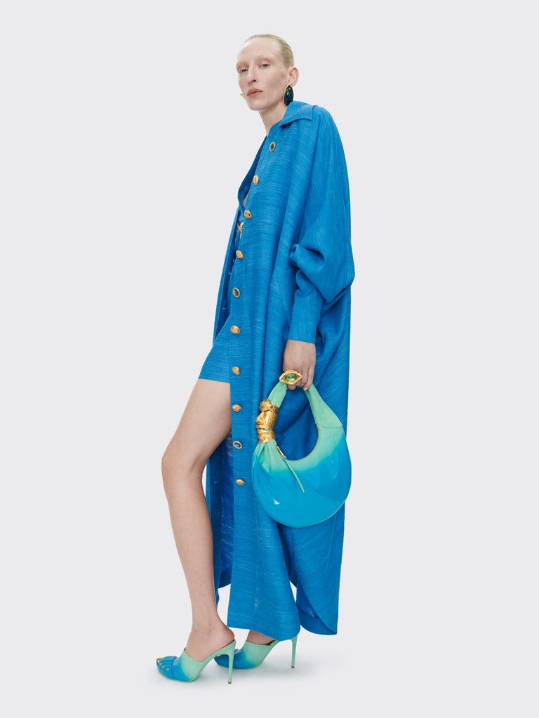 This oversized cape dress with batwing sleeves in blue silk tussah is adorned with hammered gold brass jewel buttons on the front.