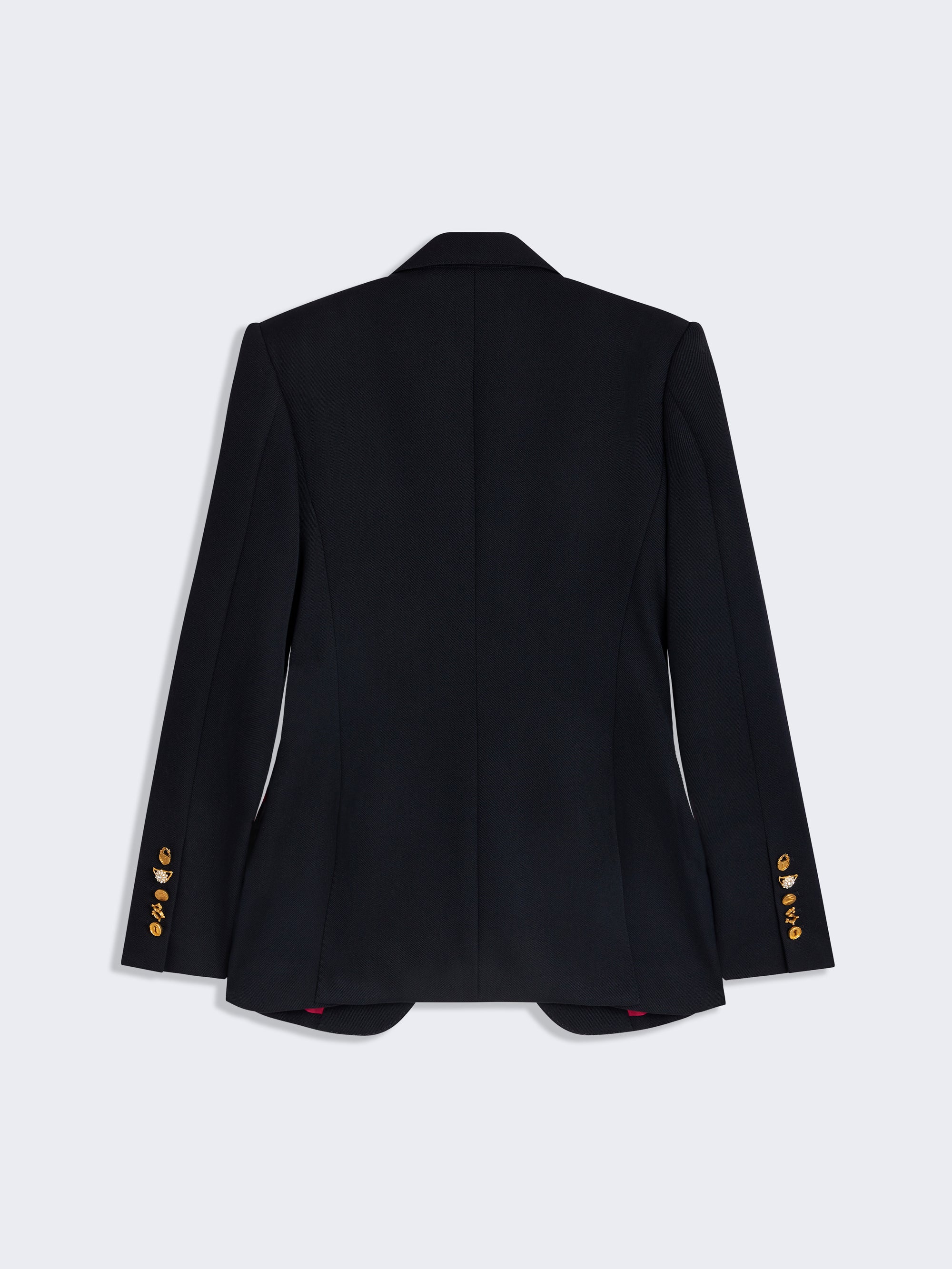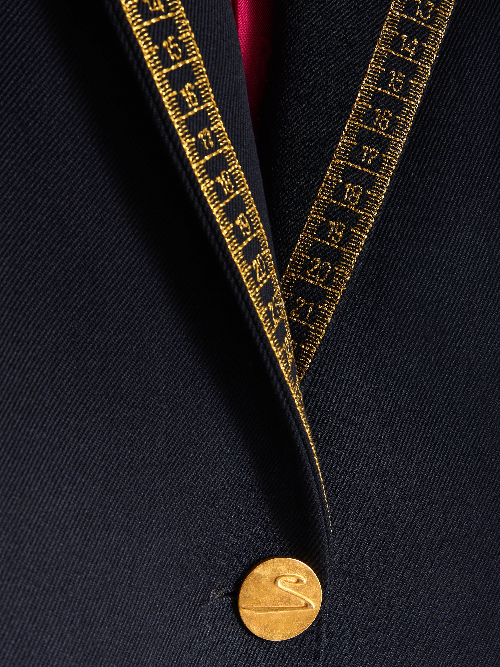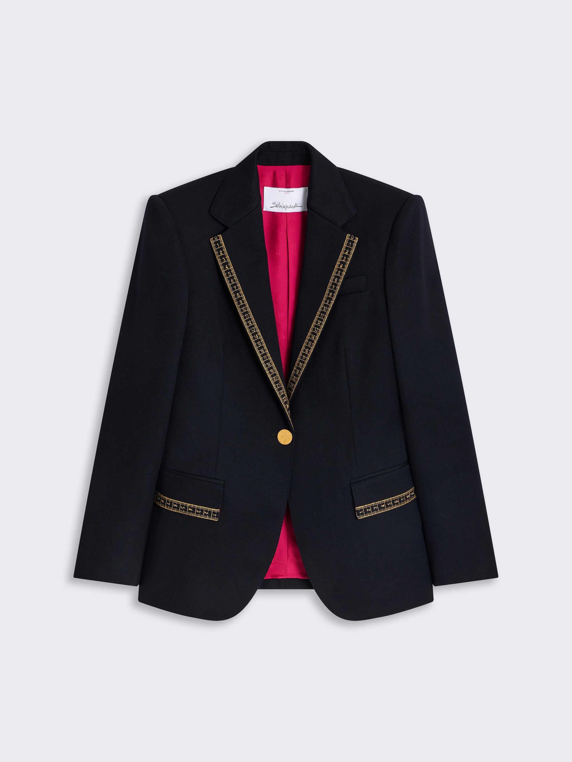 This tailored jacket with a straight cut in navy wool twill and signature Shocking! pink lining is decorated with signature Mètre Ruban embroidery in gold thread on the collar and pocket lapels.