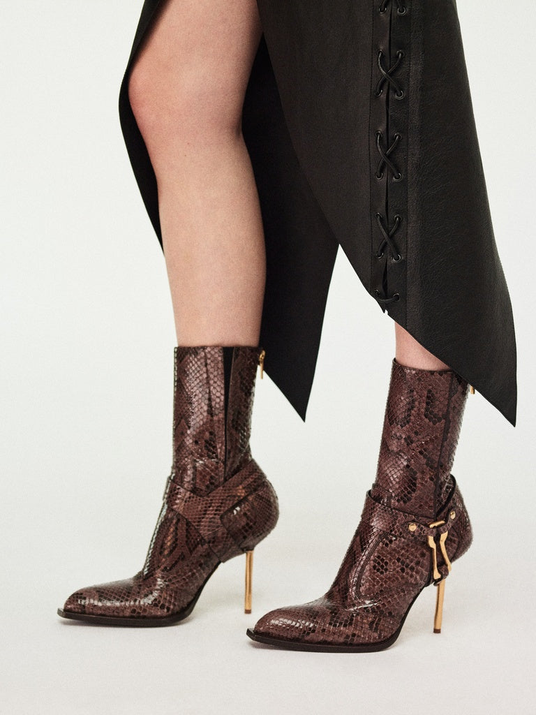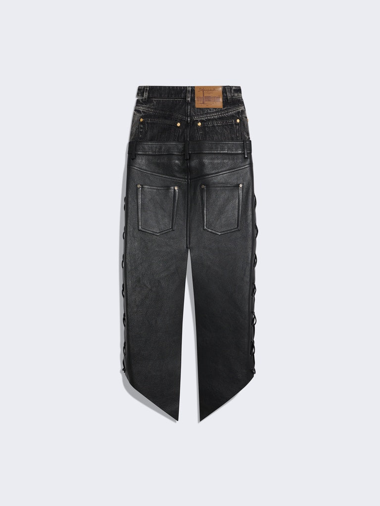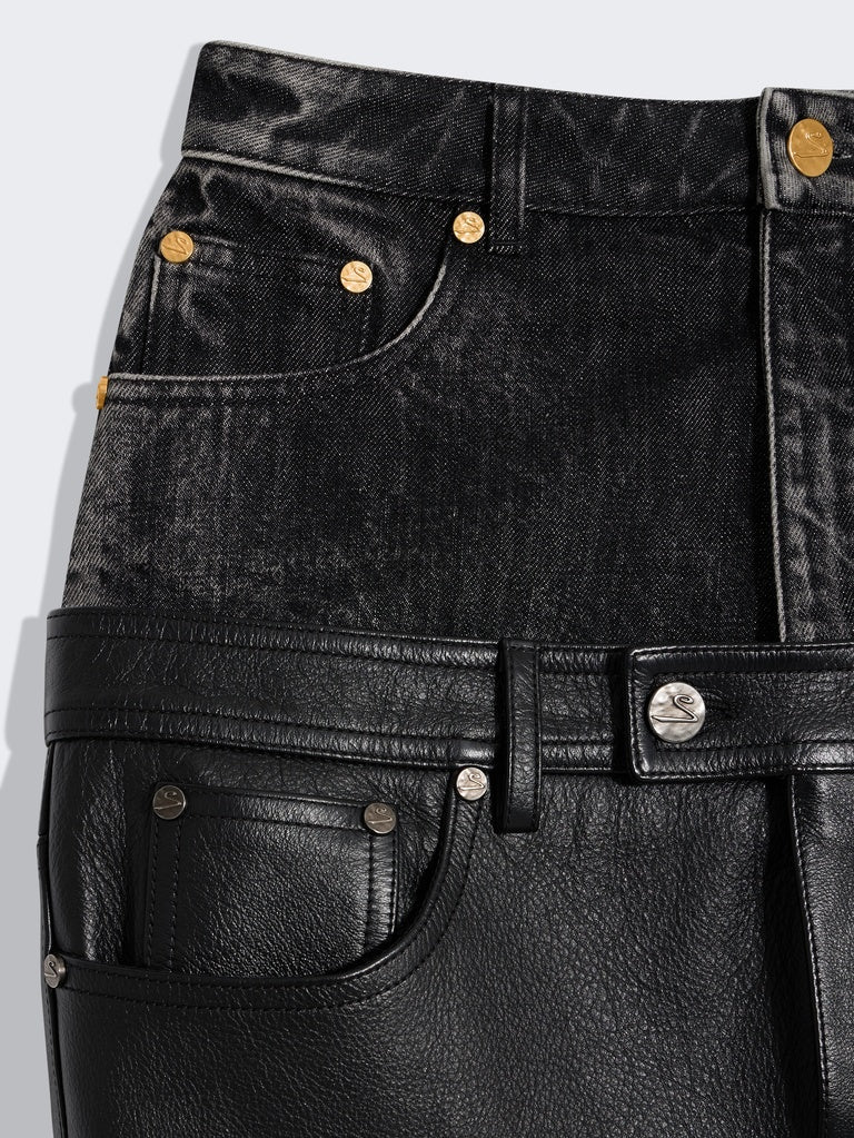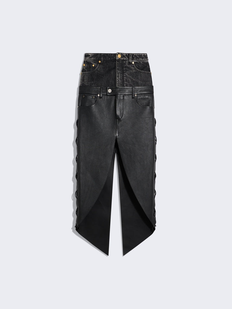 This high-waisted, trompe-l'œil pencil skirt features a black denim upper and a tone-on-tone smooth calfskin lower. It is embellished with a center back slit and silver metal eyelets with lacing details at the sides.