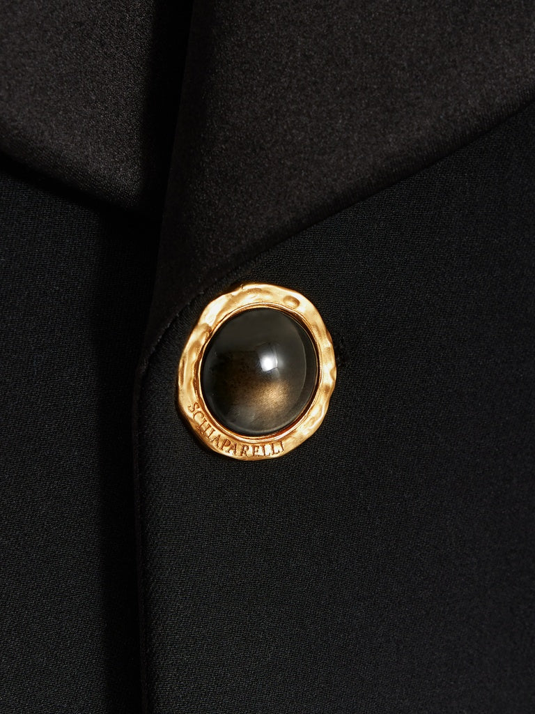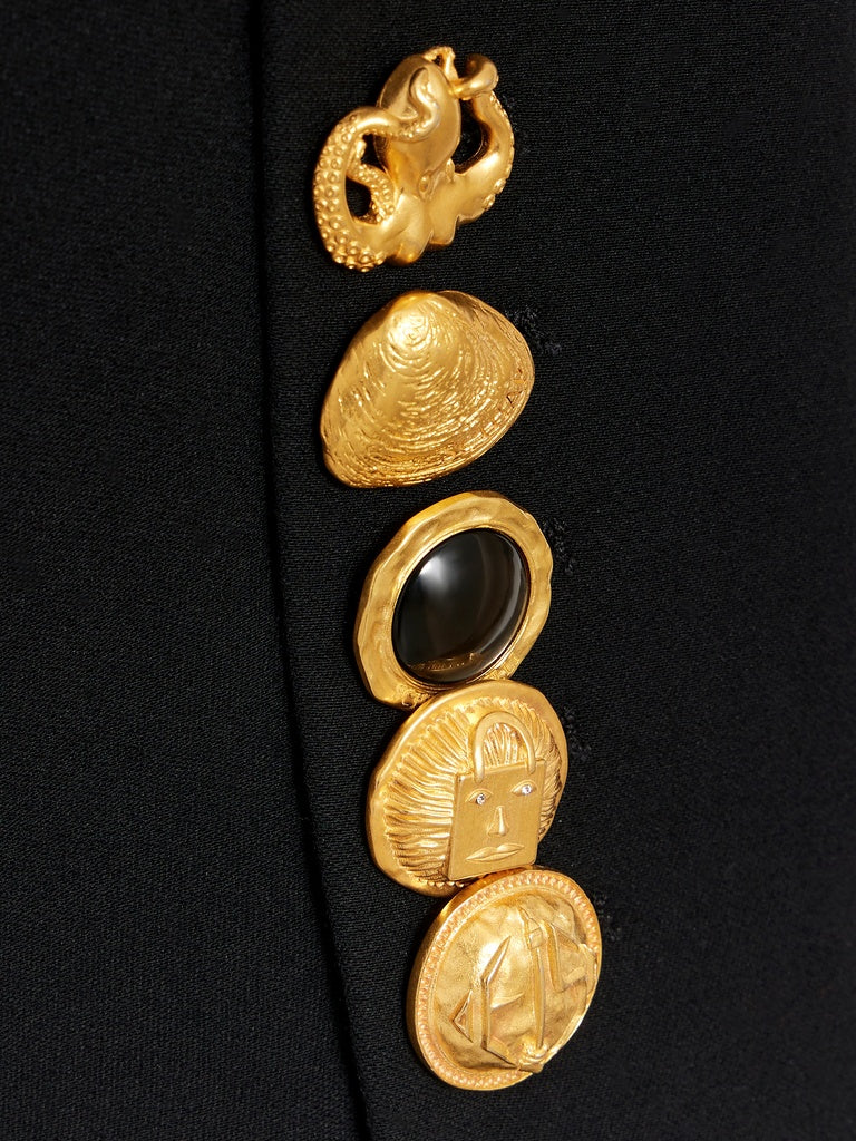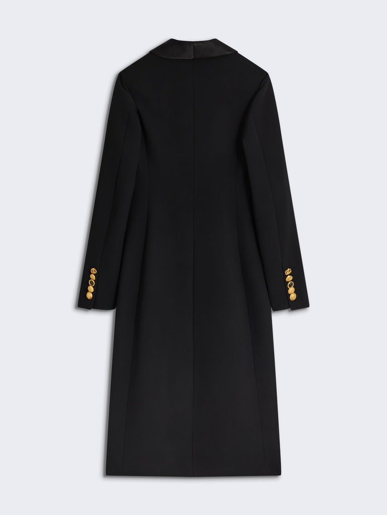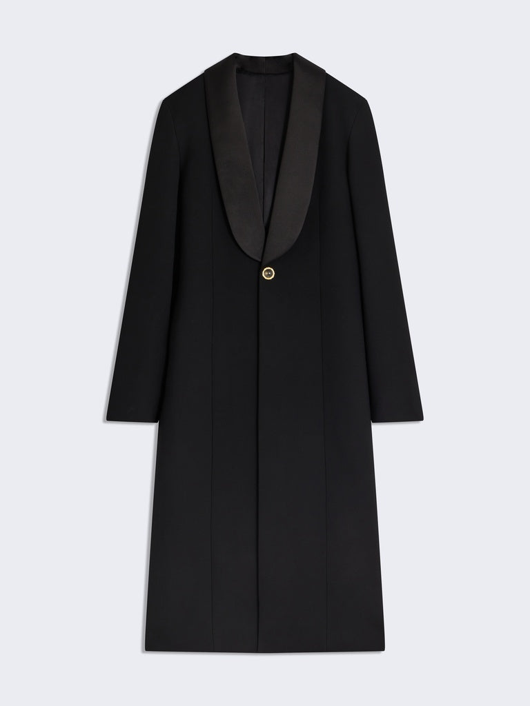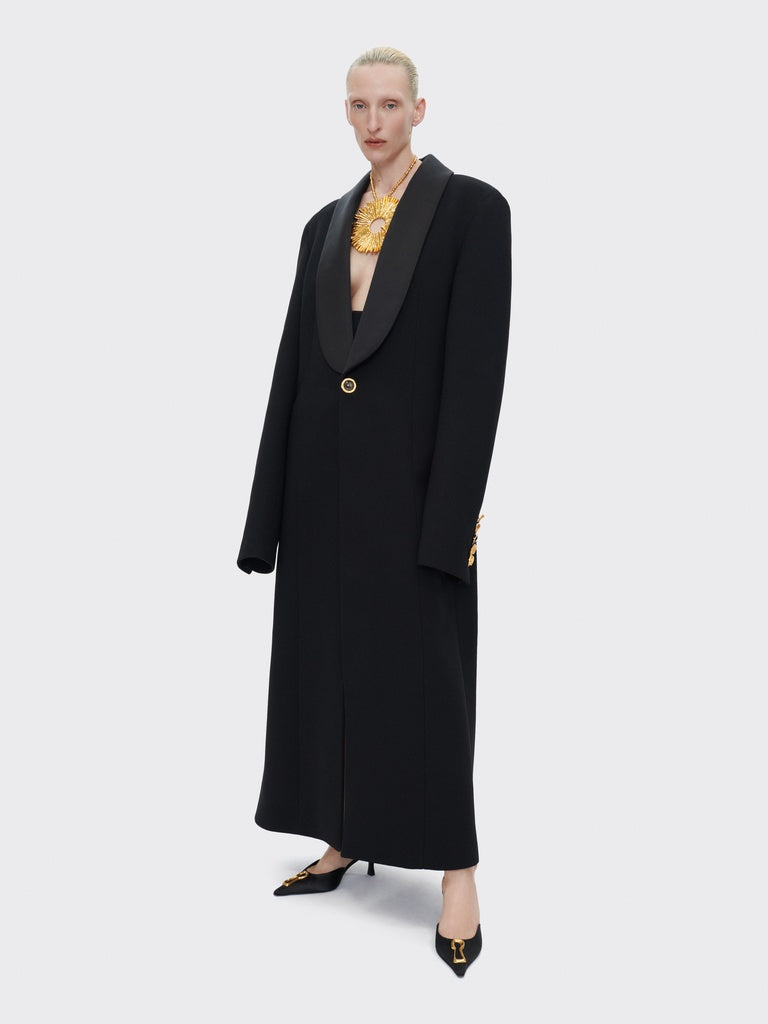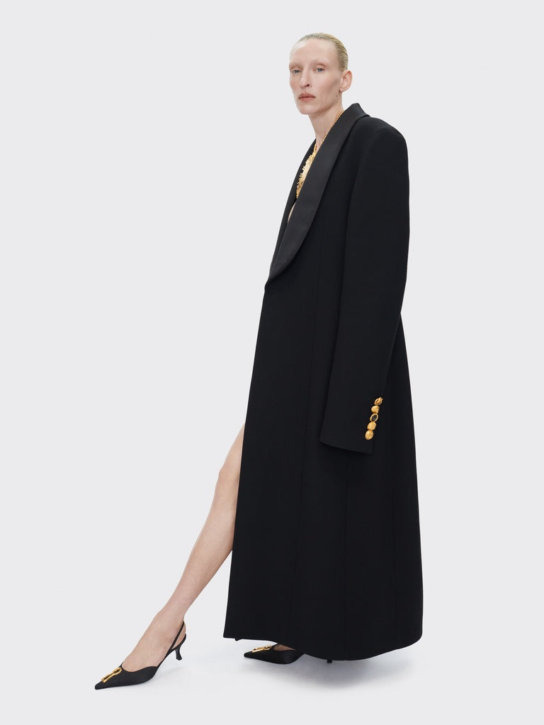 This long black double-crepe wool tuxedo coat features a tone-on-tone satin shawl collar and wide, cascading sleeves that flow to the floor. It has side slits.