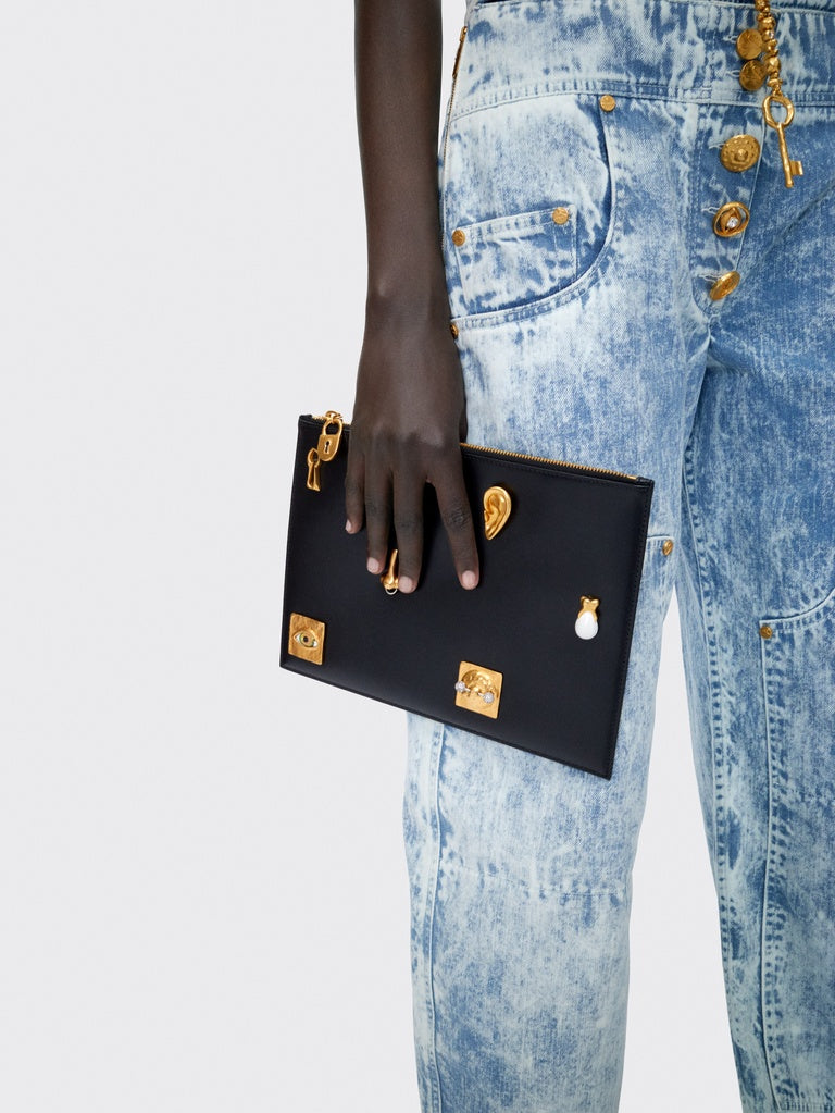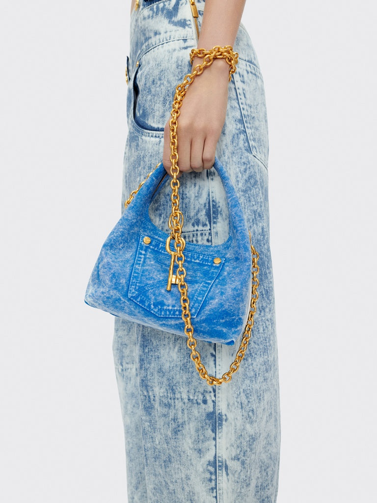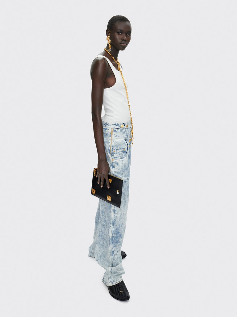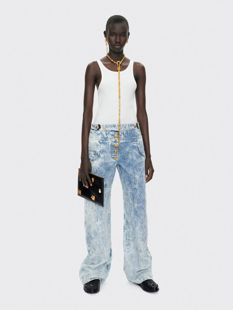 A House classic, our mid-rise, bow-leg cowboy pants are available this season in Japanese blue washed denim enhanced with tone-on-tone patches applied to the front, signature S denim buttons and rivets in gold metal and the Place Vendôme leather patch characteristic of our denim line at the waistband at the back.
