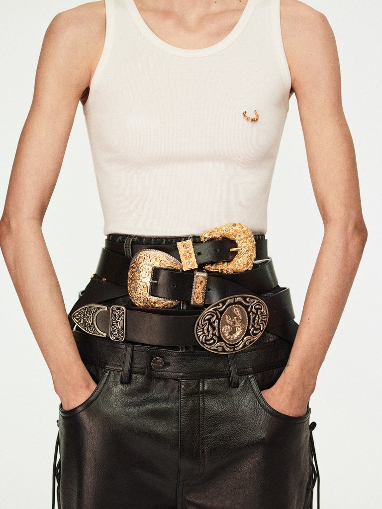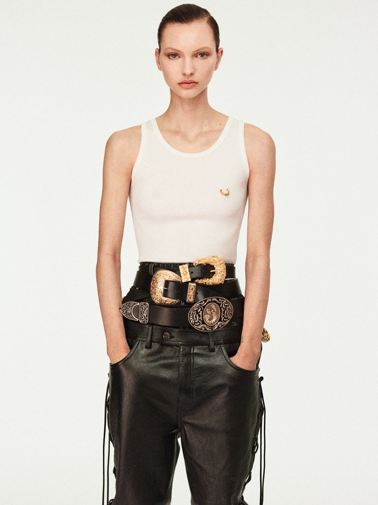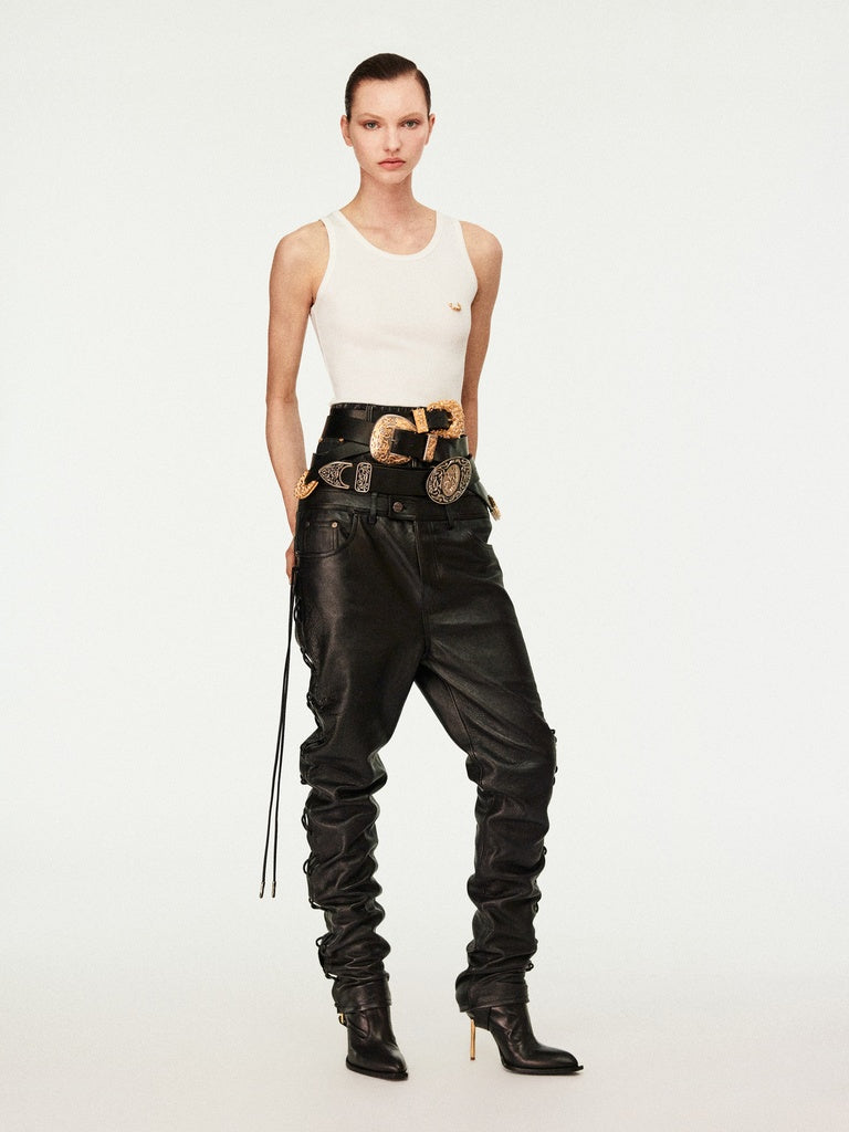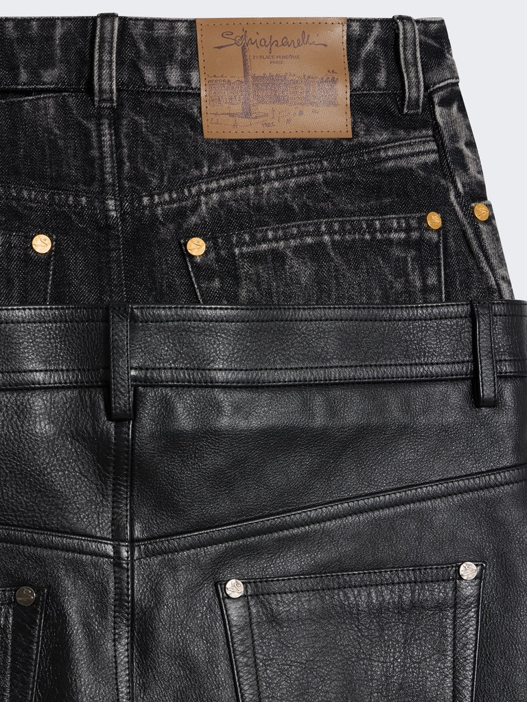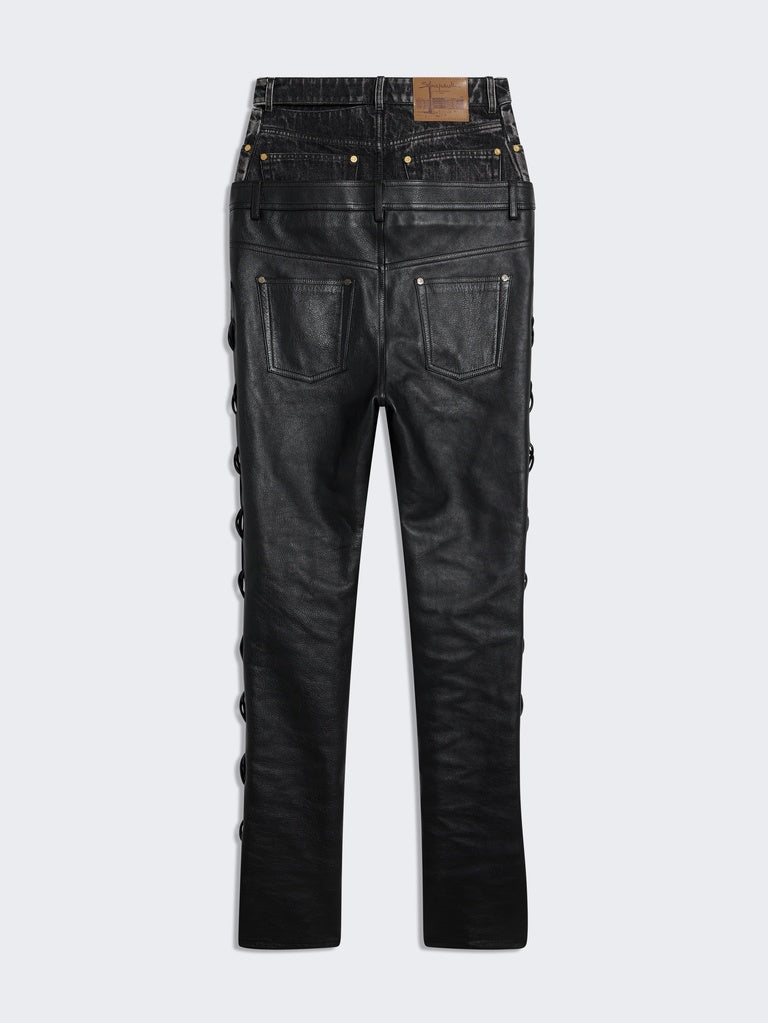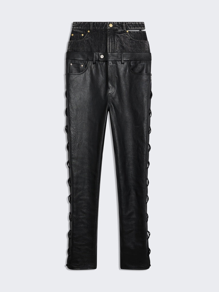 These two-tone, high-waisted trousers feature a black denim upper and tone-on-tone smooth calfskin lowers. They are finished with a slit on the left hip and silver metal eyelets with lacing details at the sides.