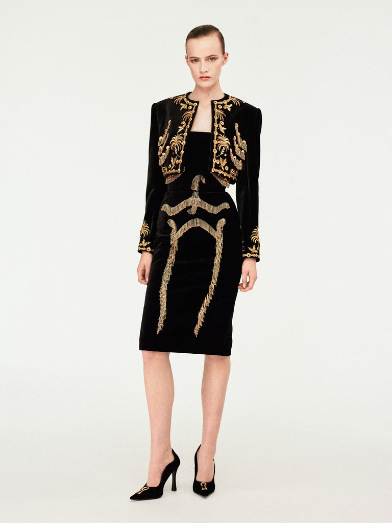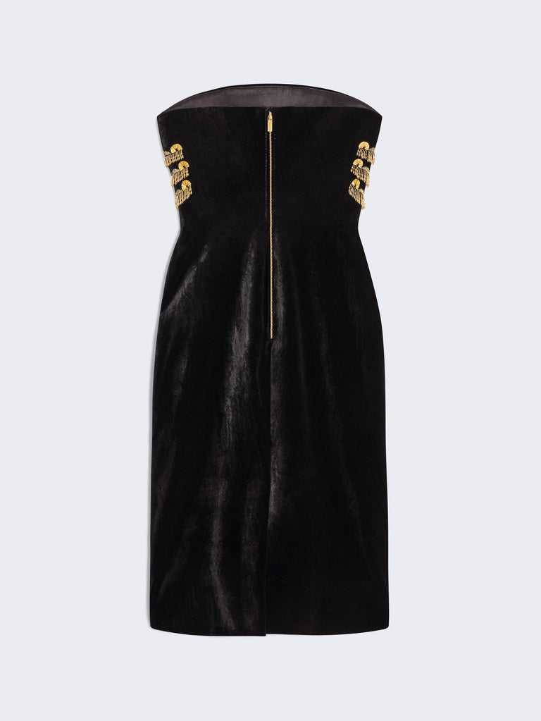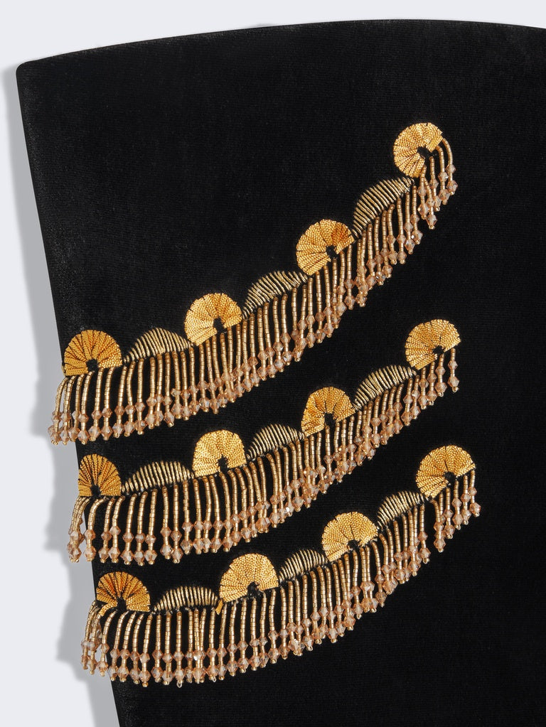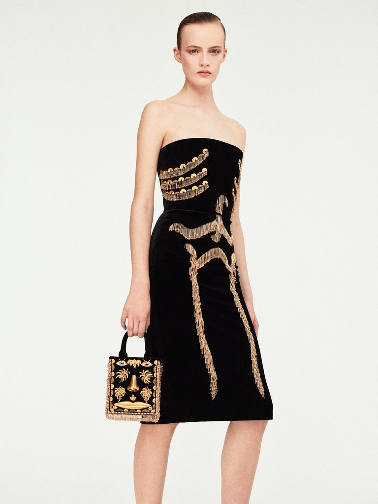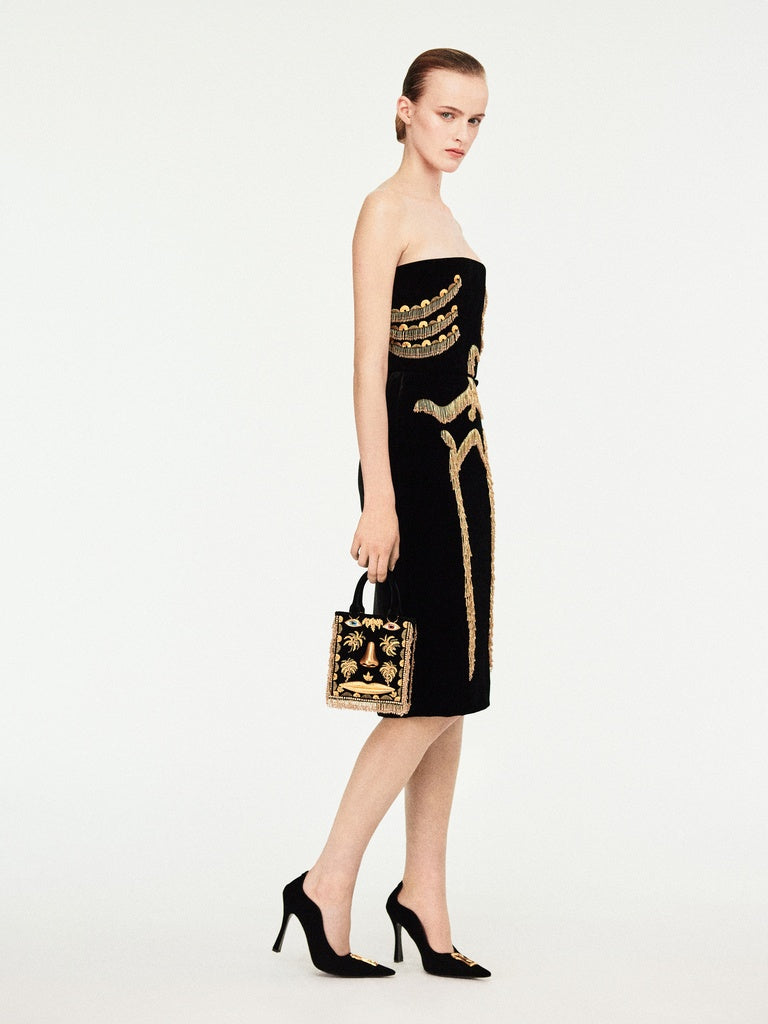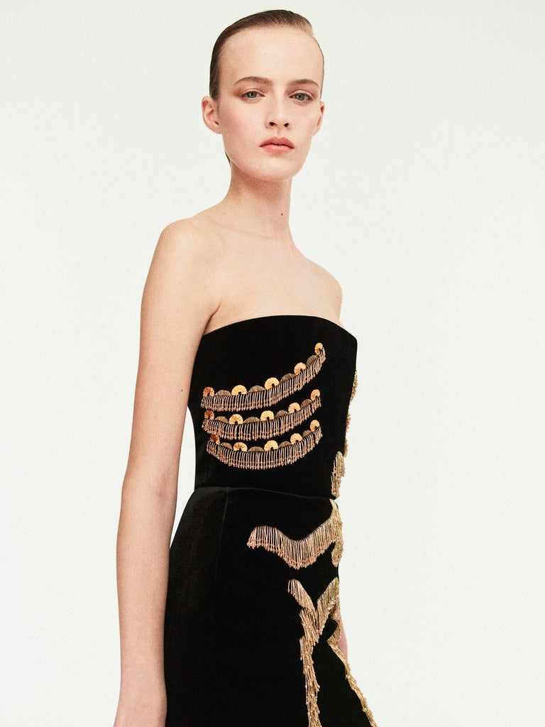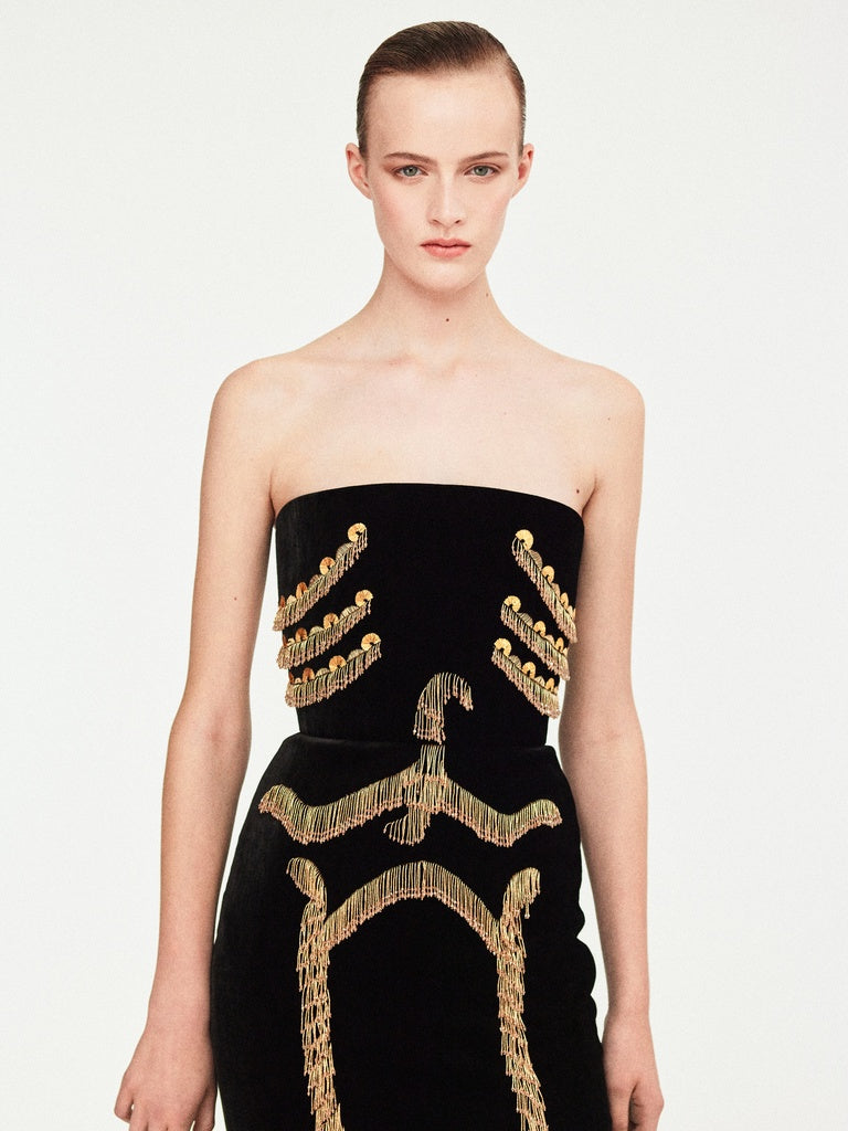 This strapless, tube-shaped dress with a close-fitting cut is made of black velvet. It is embellished with skeleton embroidery in lamé thread and contrasting gold beaded fringe.