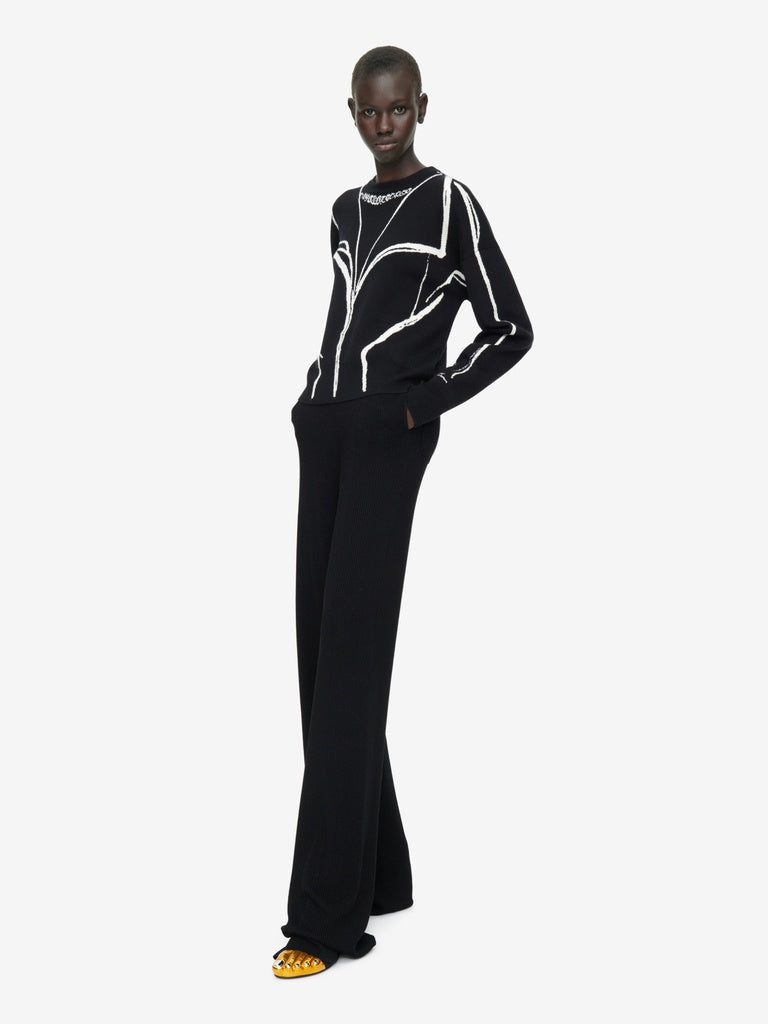 These flowing pants in textured black viscose knit with wide legs in a pyjama style are enhanced with side pockets and a gold Keyhole rivet at the back.