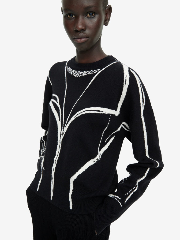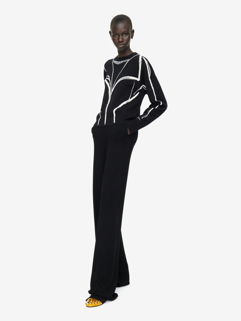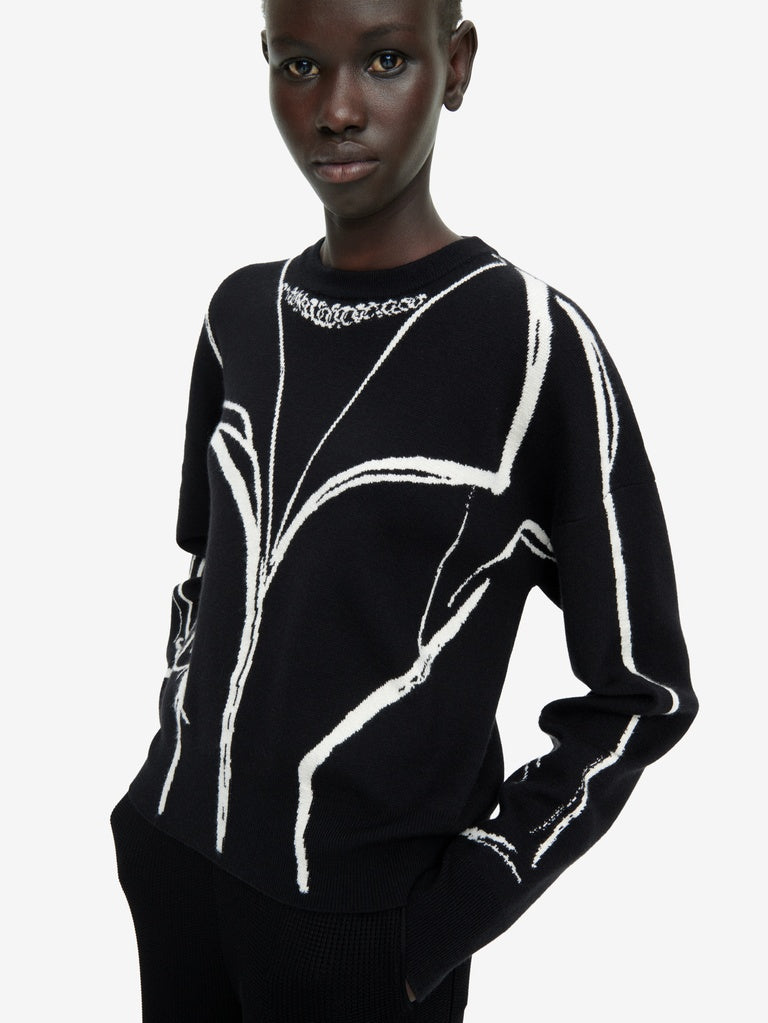 This black cashmere, wool and silk round neck jumper with long sleeves is enhanced with a white trompe l'oeil jumper design by Daniel Roseberry on the front and a gold Keyhole rivet on the back.