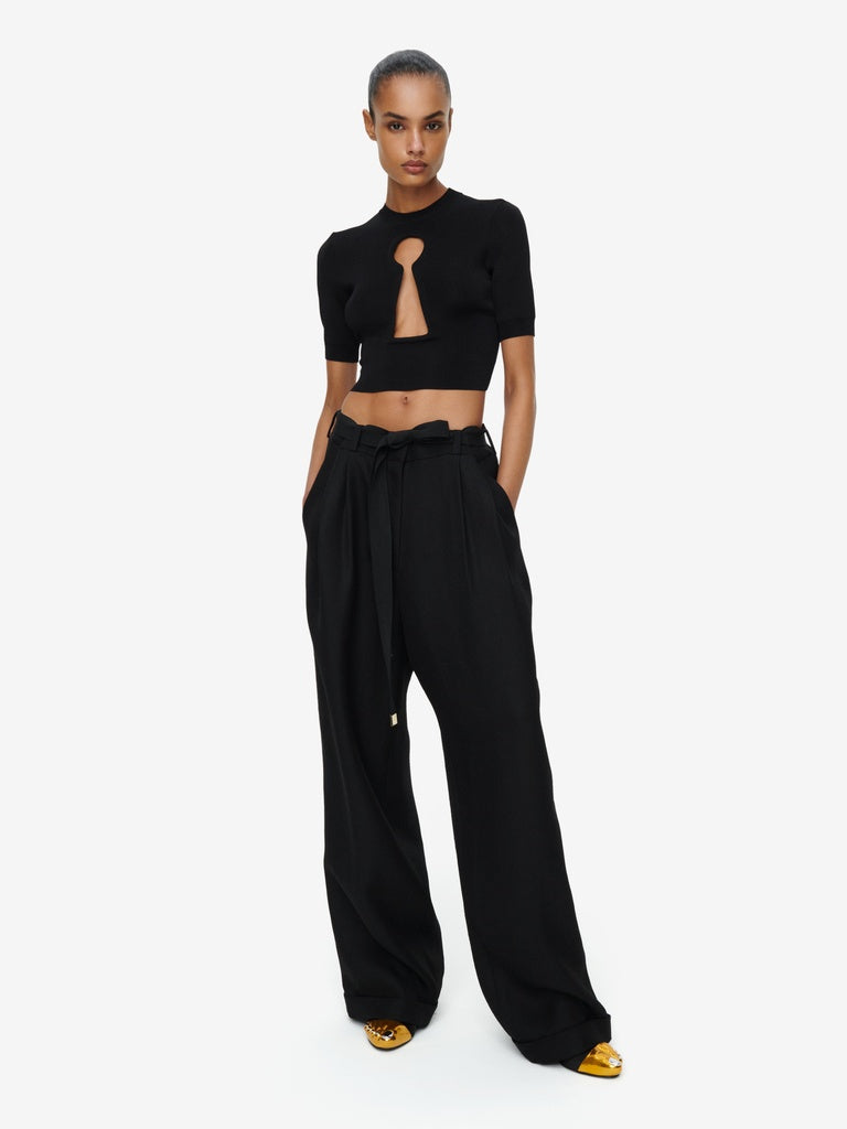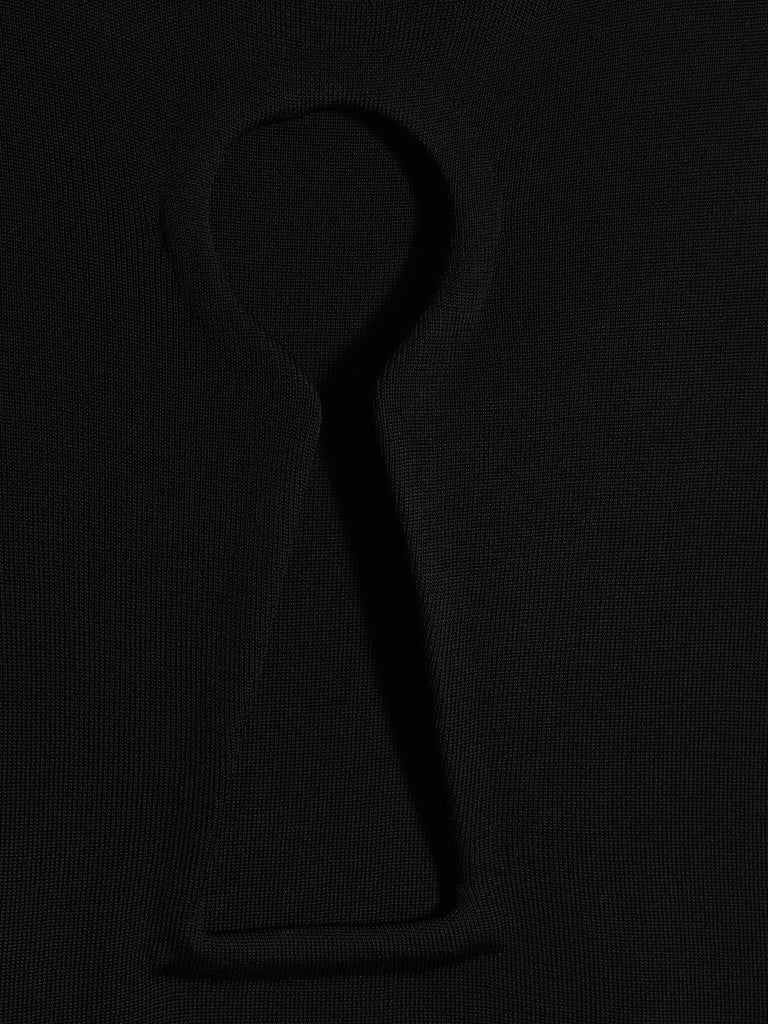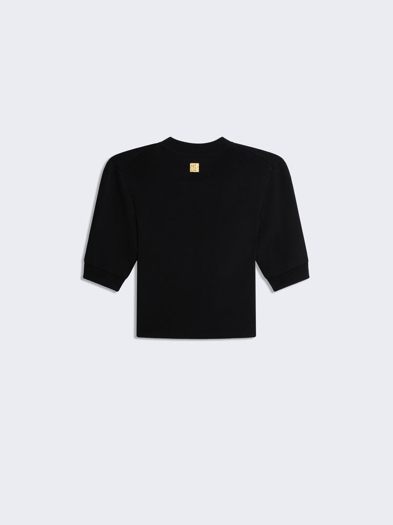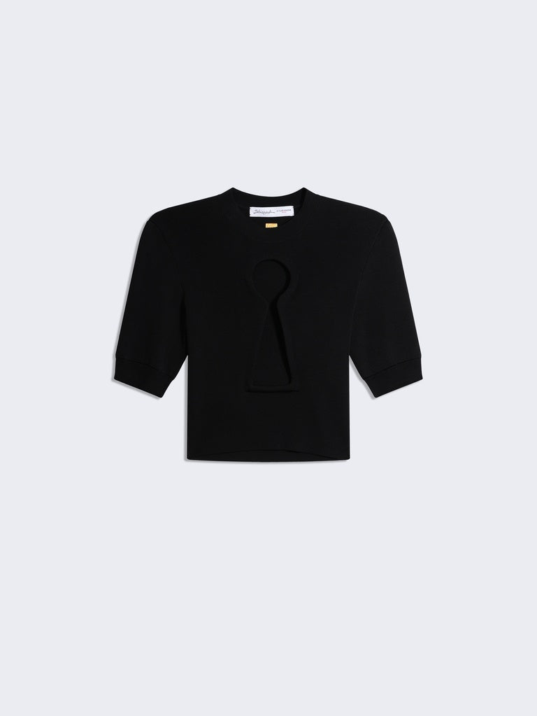 This top with short sleeves and a round neckline is made from black viscose knit. It features a signature Keyhole cut-out and is embellished with a gold Keyhole rivet on the back.