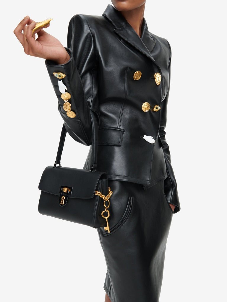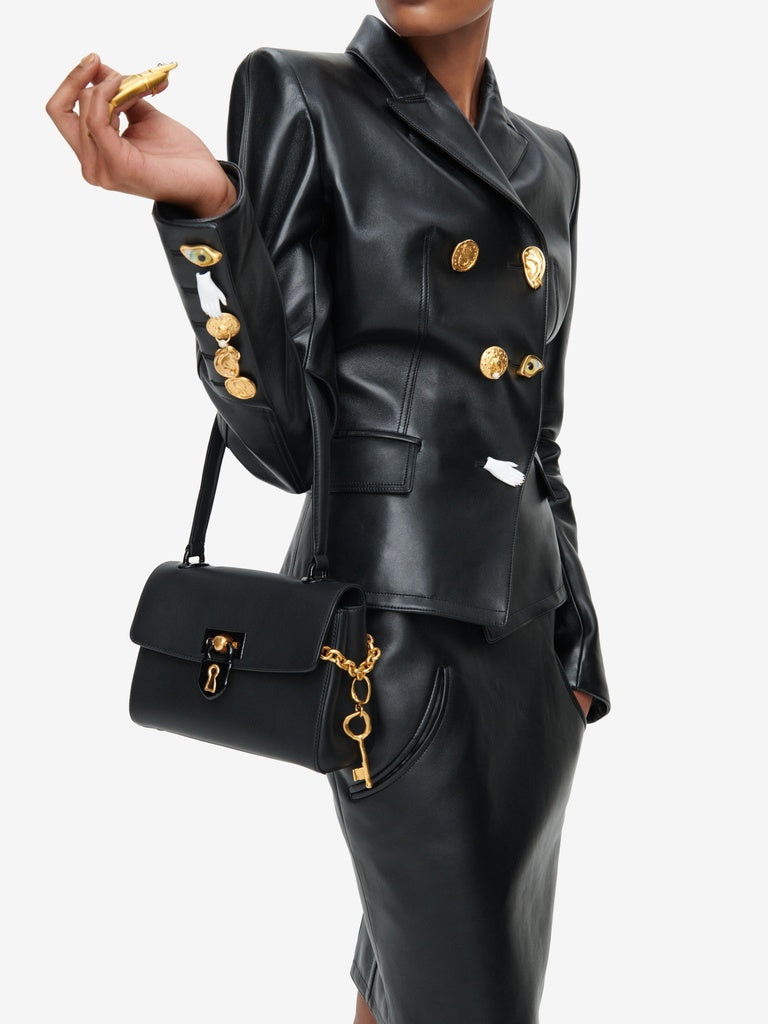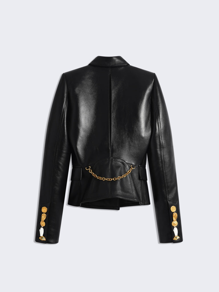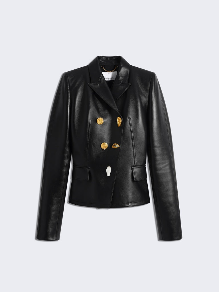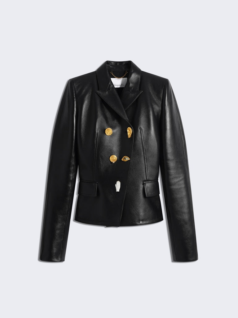 This tailored jacket, which can be worn double-breasted or single-breasted, is made from black lambskin leather. Its fitted cut is enhanced by a rounded yoke and box pleats at the back, gold metal bijoux buttons down the centre front and on the cuffs, and a gold chain and gold Keyhole rivet at the back.
