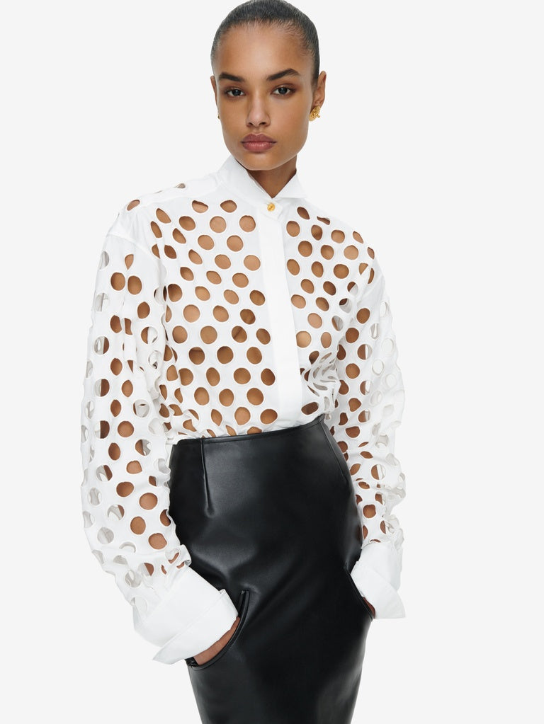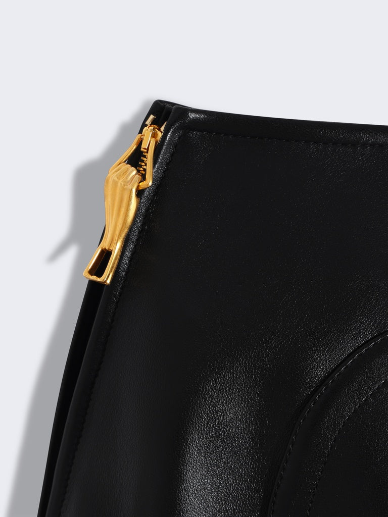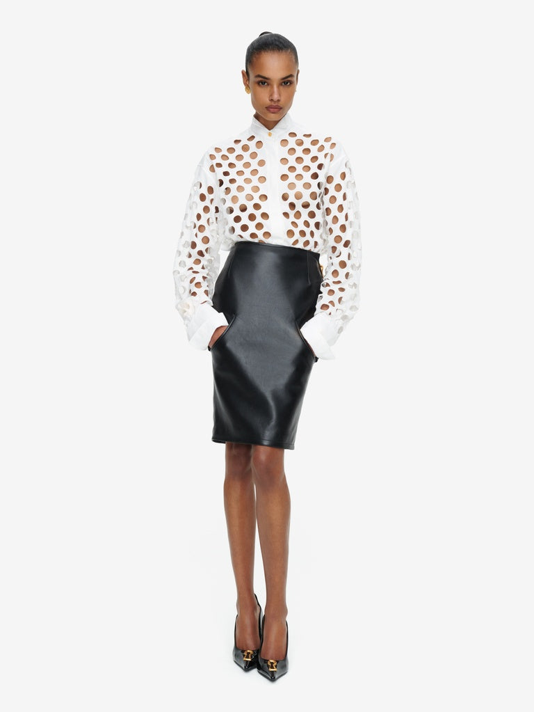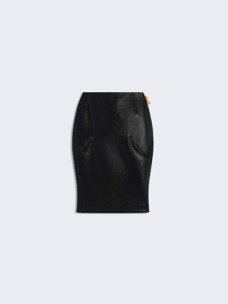 This pencil skirt is made from black lambskin leather. It features rounded piped pockets and a double zip fastening at the centre back, creating a slit.