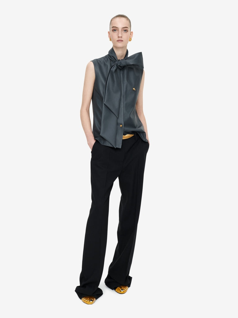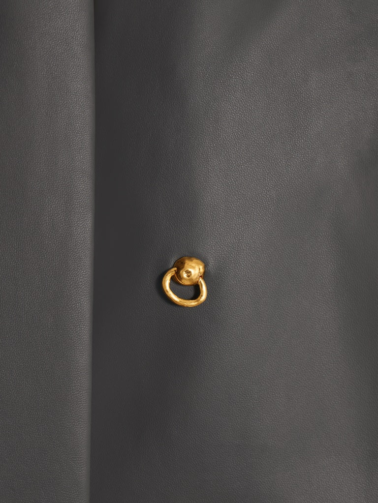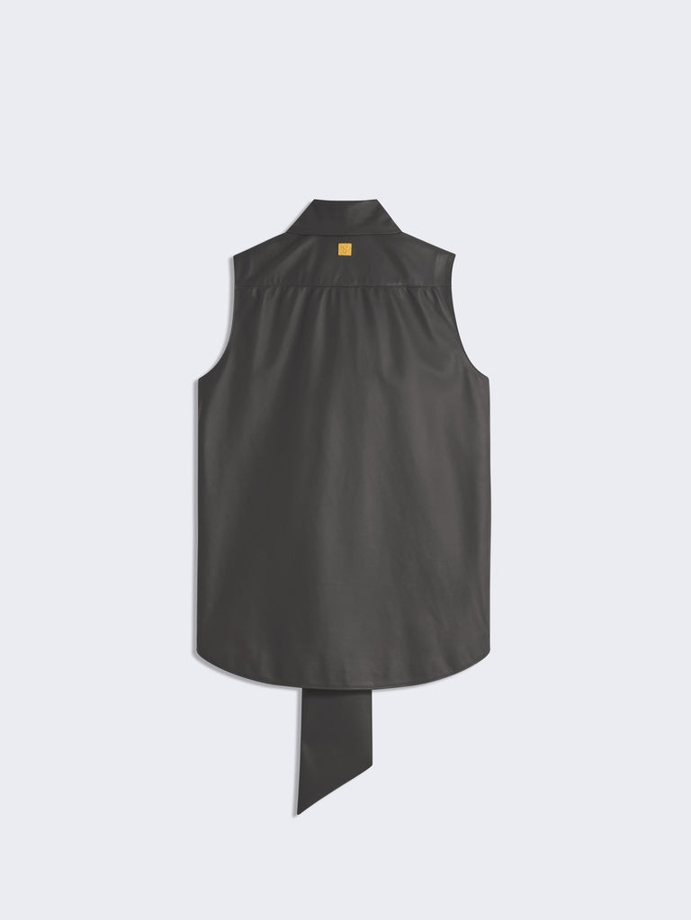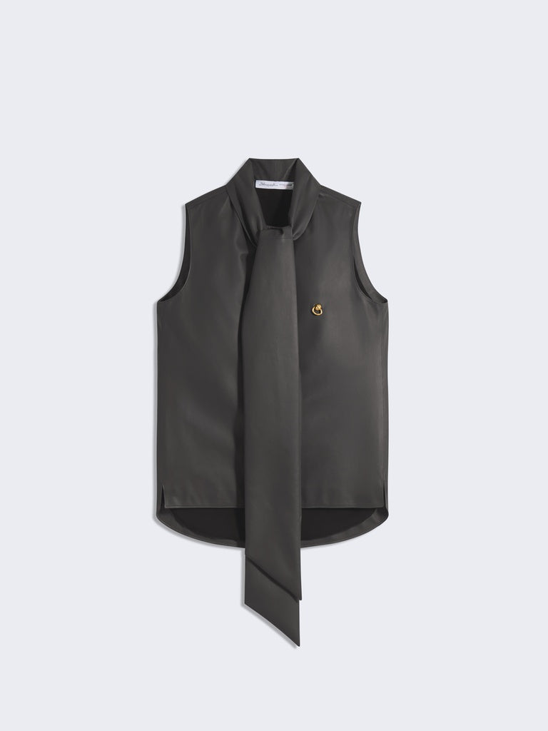 Top à lavalière sans manche en cuir souple noir rehaussé d'un piercing sur la poitrine.