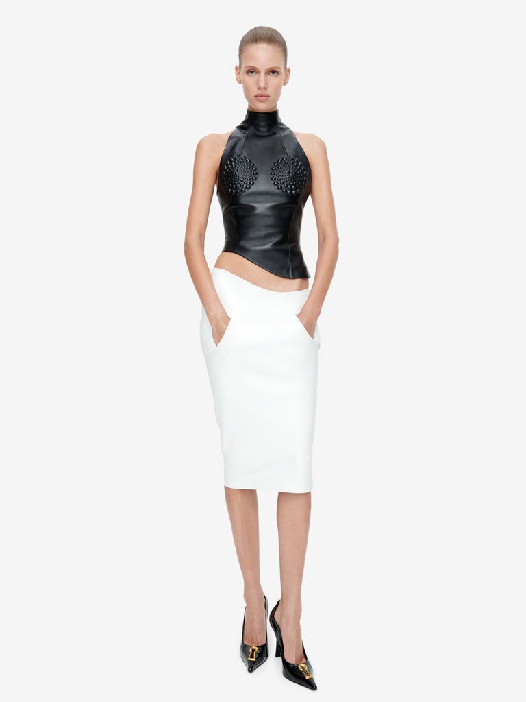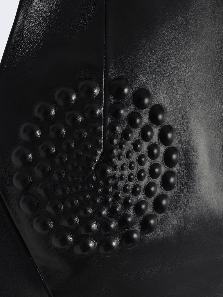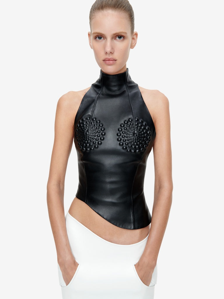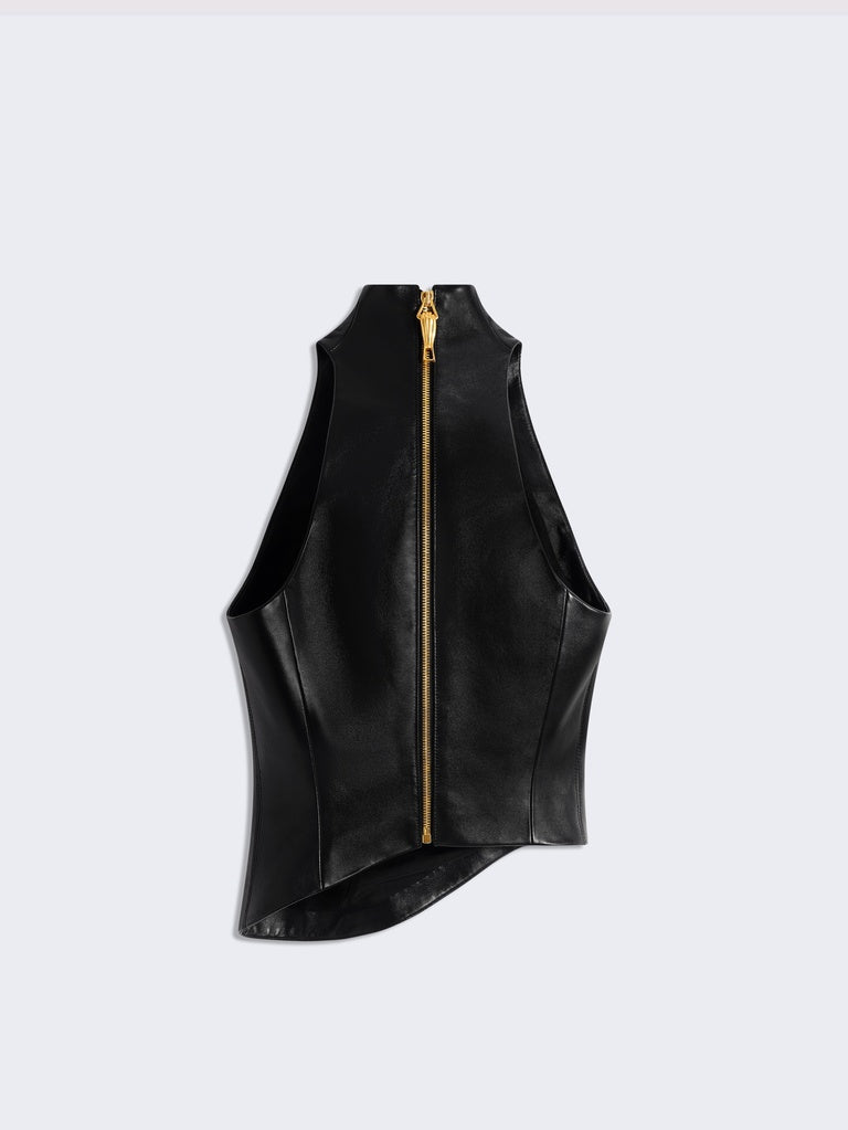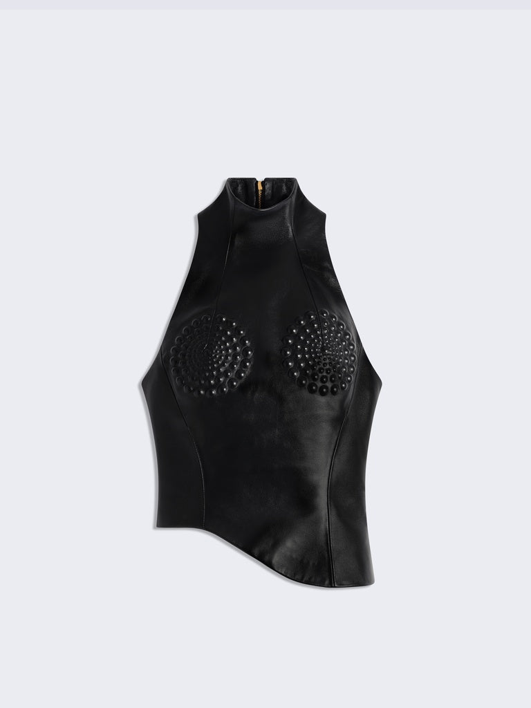 This asymmetrical high-neck top is crafted from supple black leather. It is embellished with tonal trompe l'oeil embossing inspired by the Maison's archives and a wave-like hem.