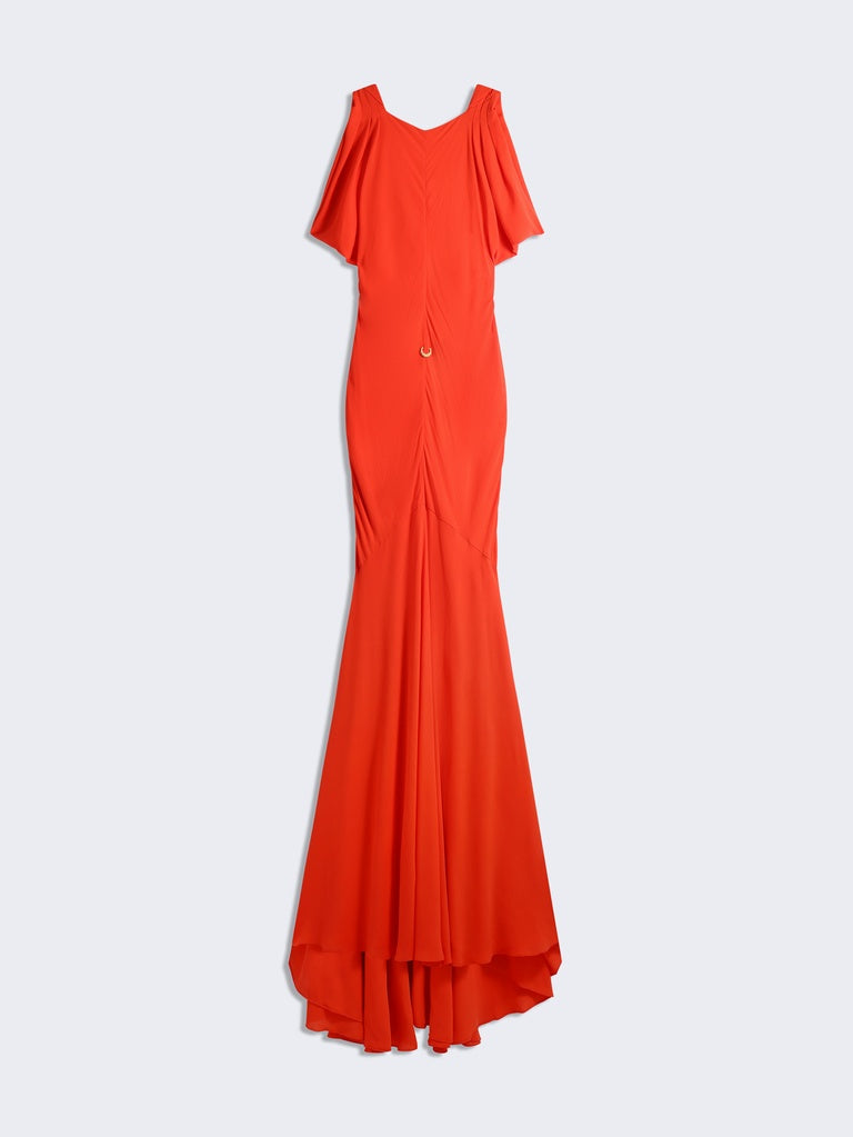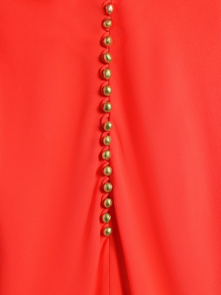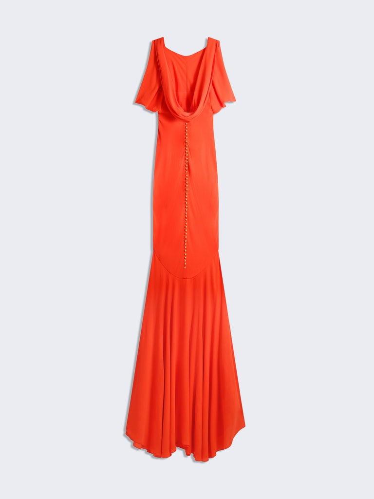 Backless evening dress in lightweight coral red sanded crepe draped over the shoulders and backless cowl neckline embellished with gold bijoux buttons and piercing at the navel.