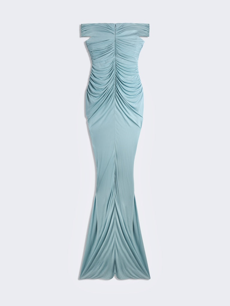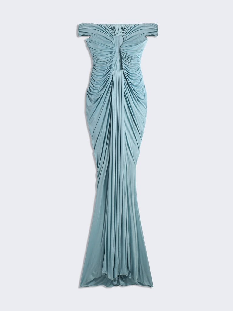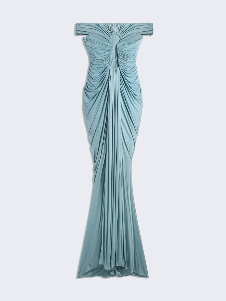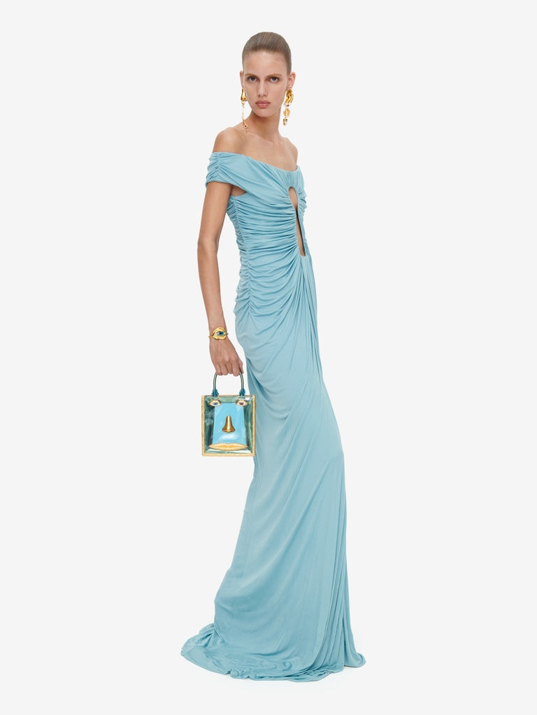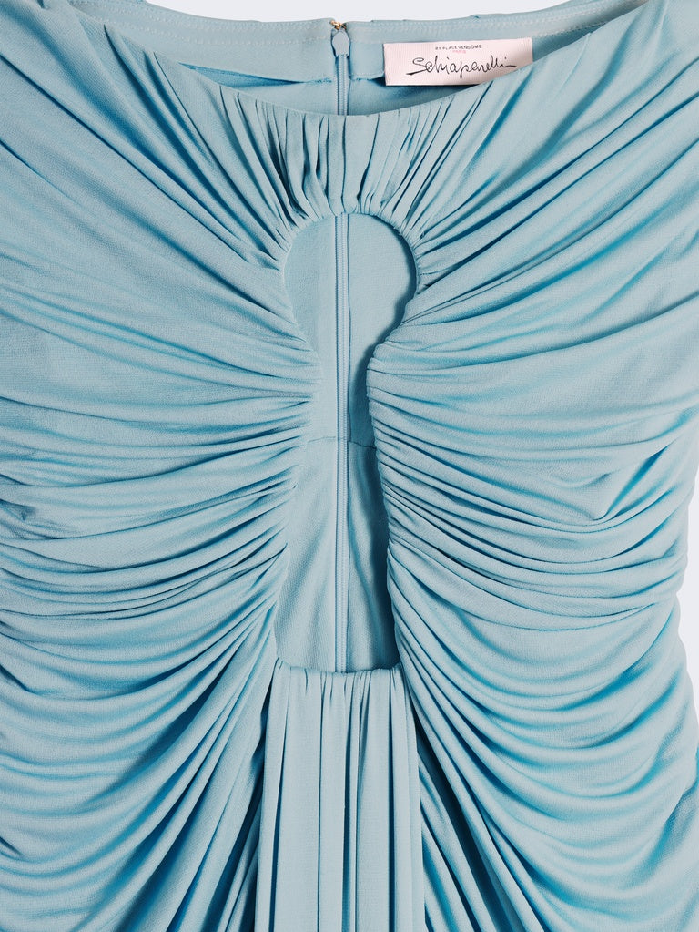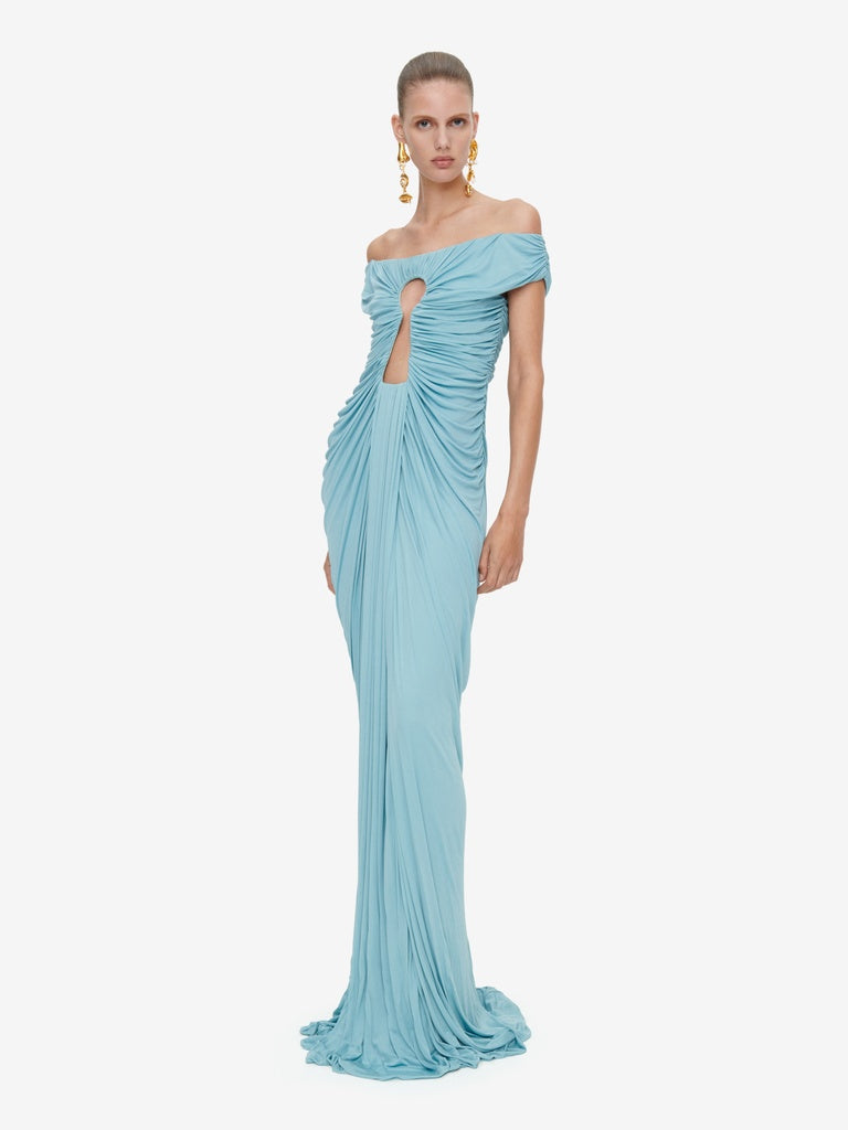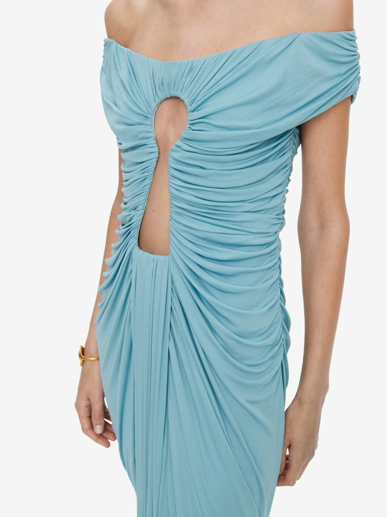 Long dress in lightweight blue-grey draped jersey with bare shoulders and a straight neckline featuring the signature Keyhole cut-out in the centre.