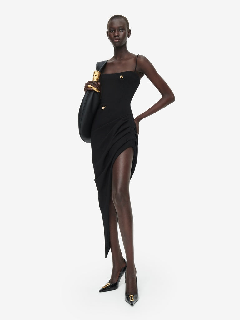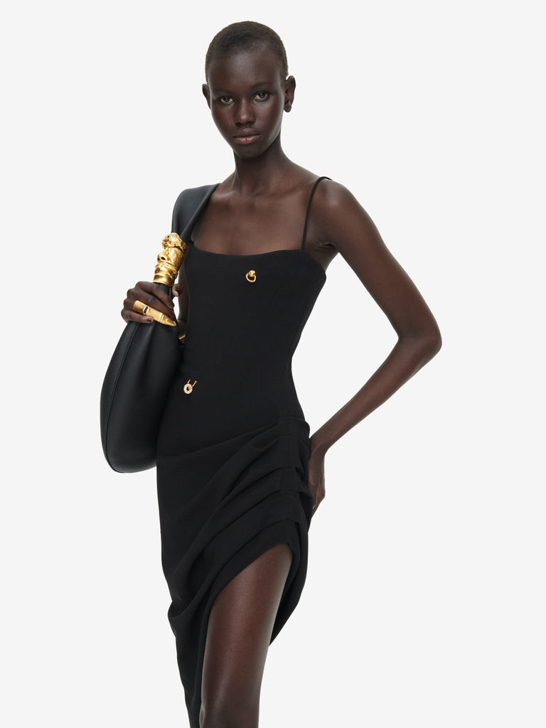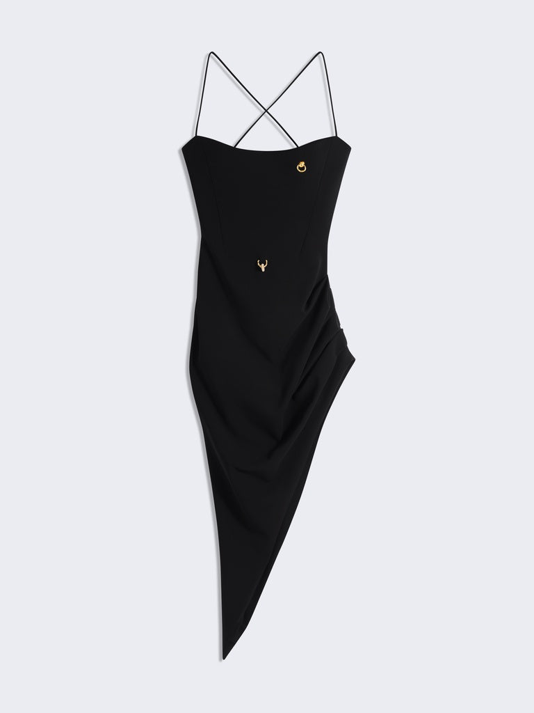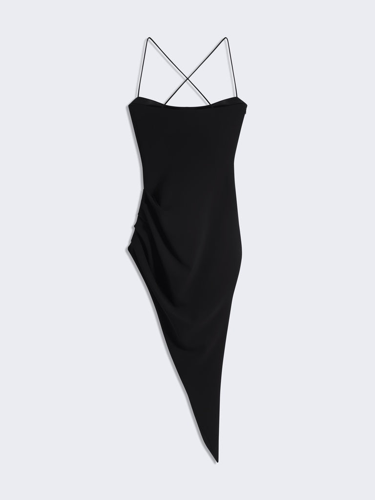 Asymmetrical dress with thin straps crossed at the back in compact black jersey with volume gathered at the left hip creating pleats.