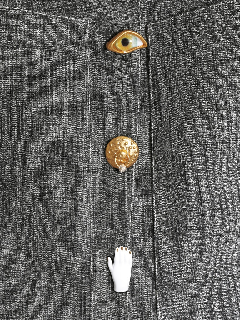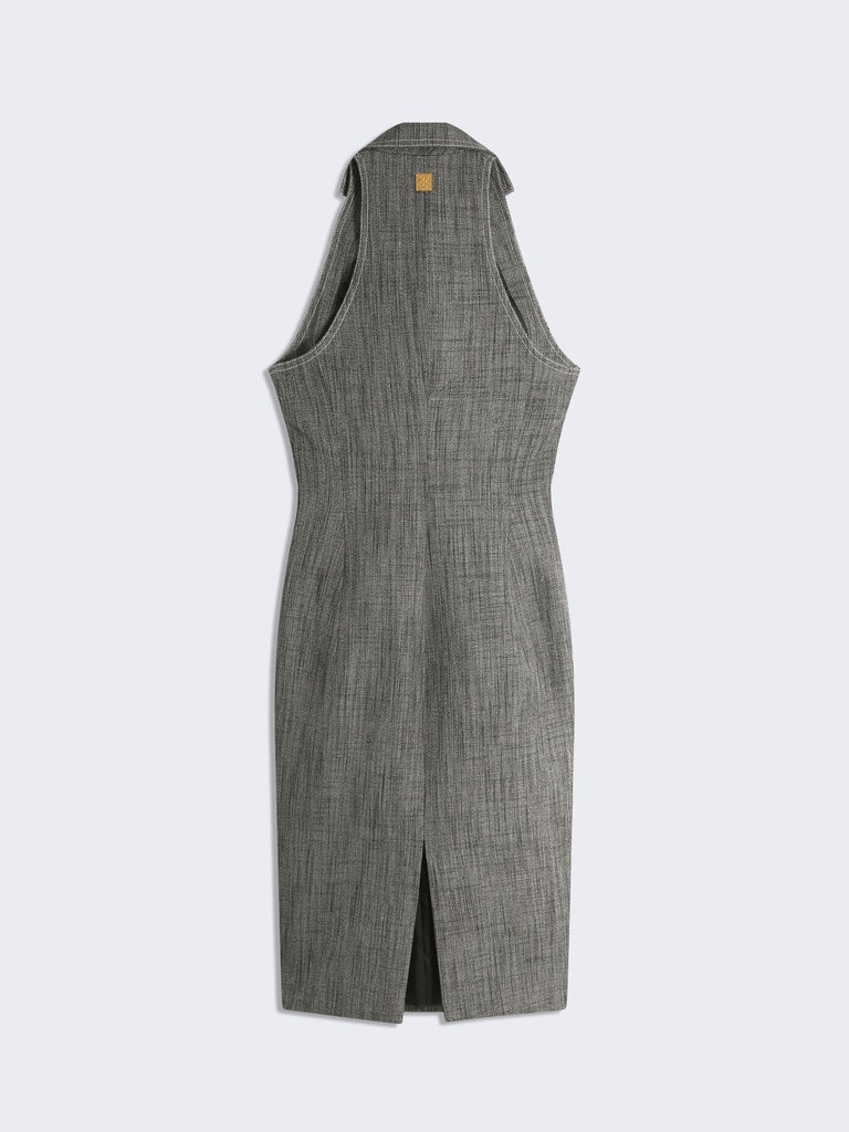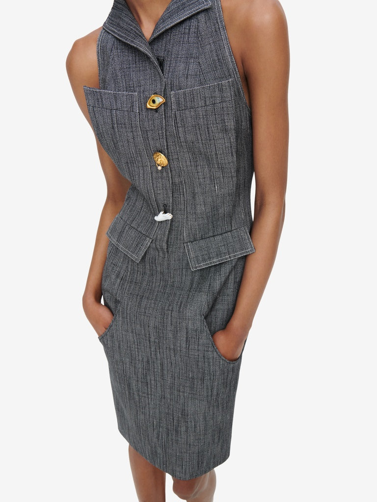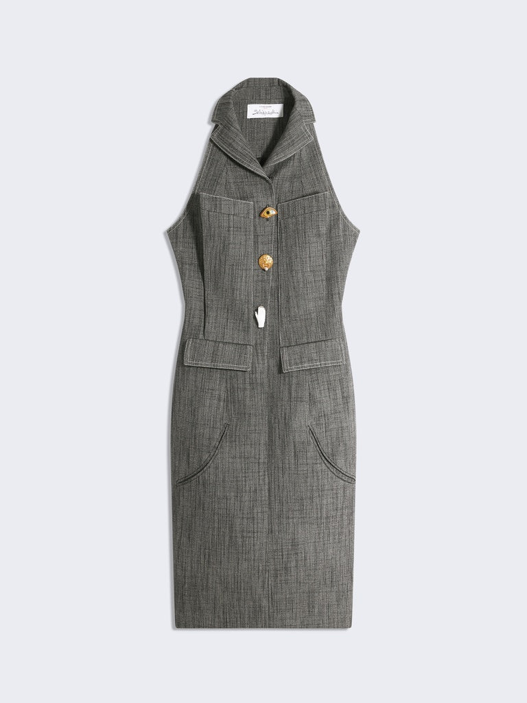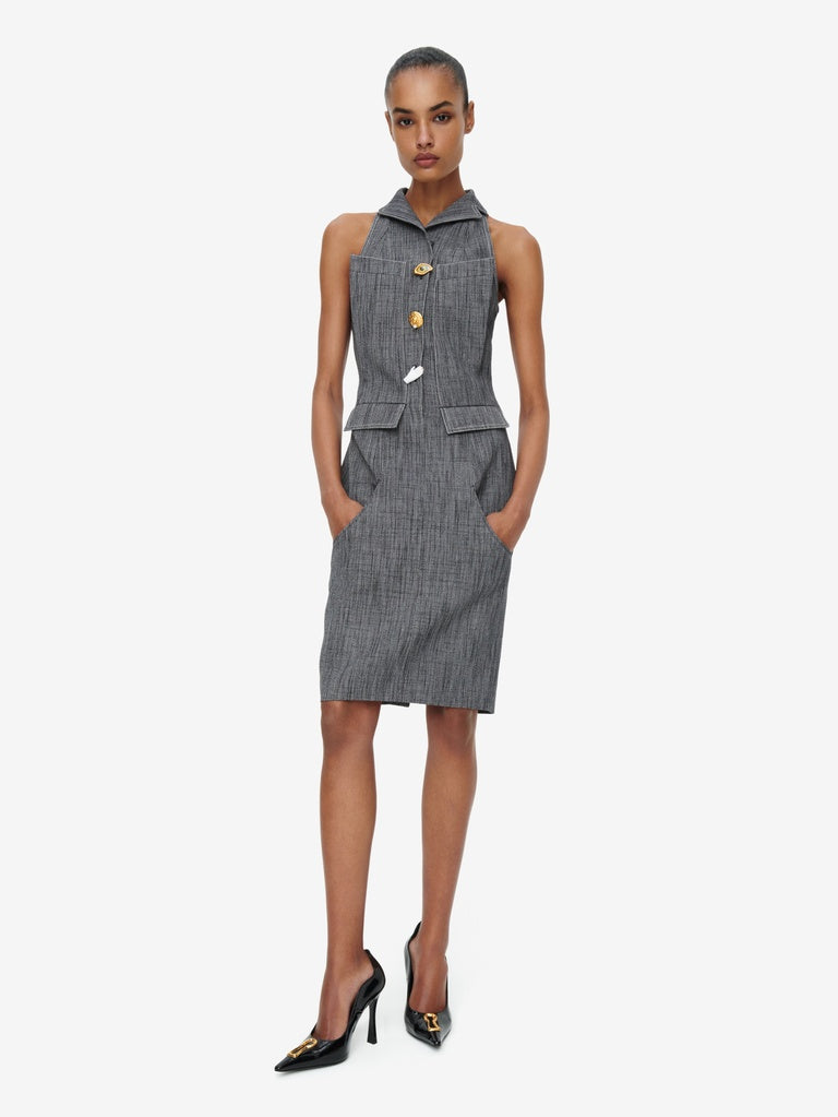 This sleeveless knee-length dress with a swimmer's back is made from grey mottled canvas. It is embellished with a small tailored collar, large pleated pockets on the chest, rounded piped pockets at the bottom and gold bijoux buttons down the centre front.