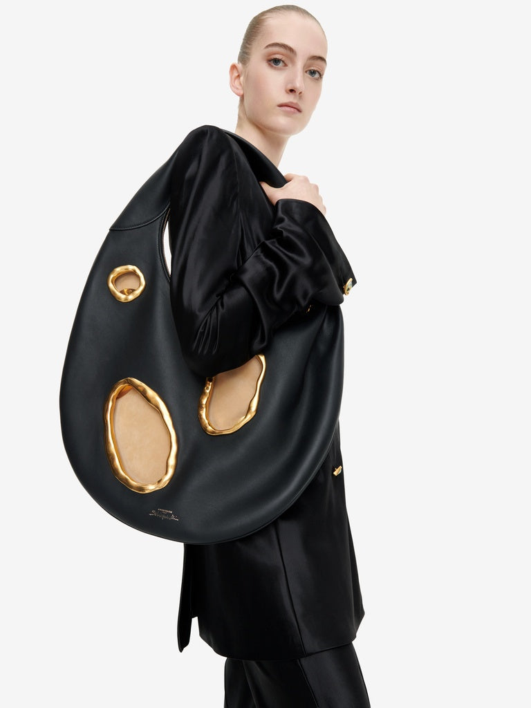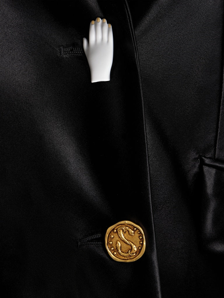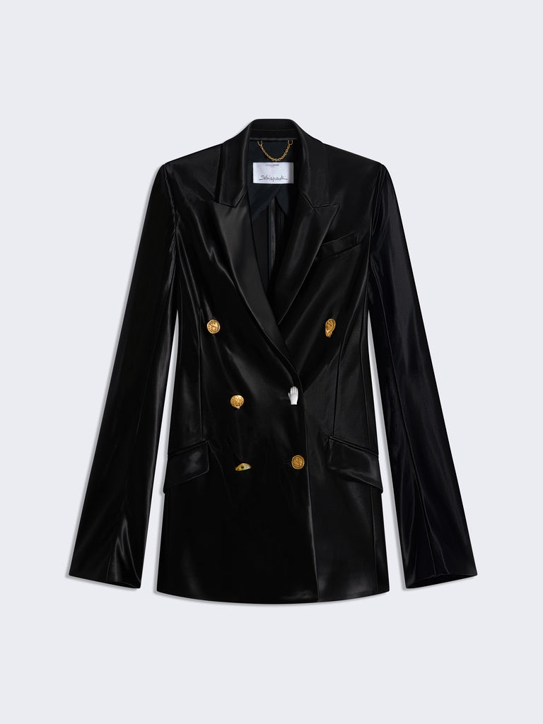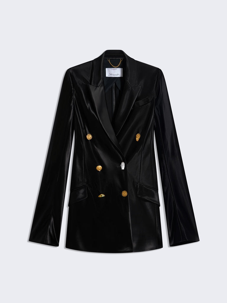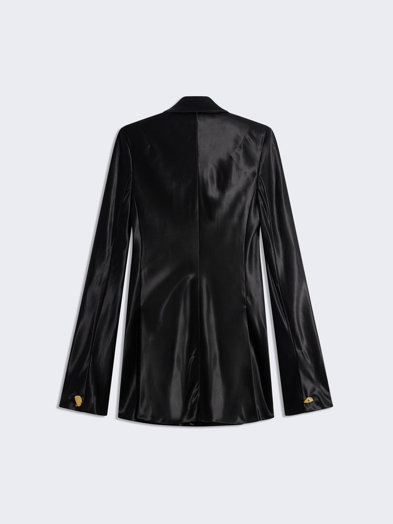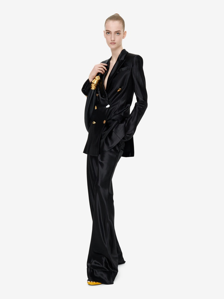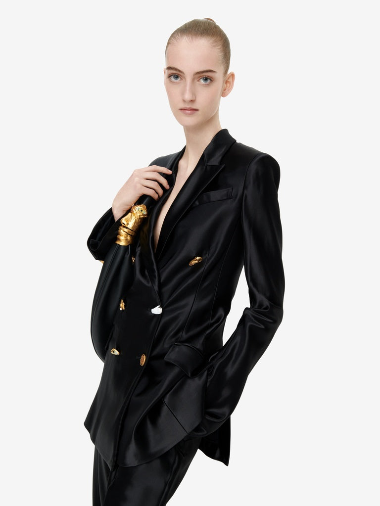This double-breasted tailored jacket is cut on the bias in flowing satin. It is enhanced with a breast pocket, flap pockets at the hips, and gold bijoux buttons down the centre front and at the bottom of the sleeves.