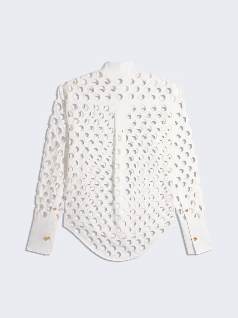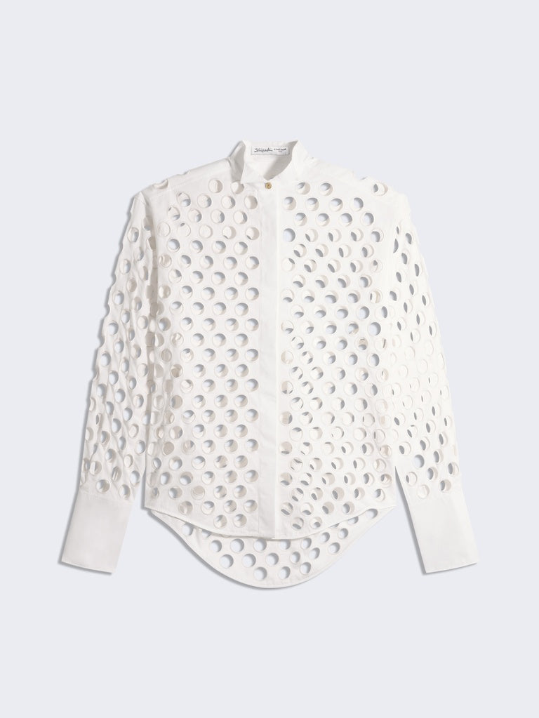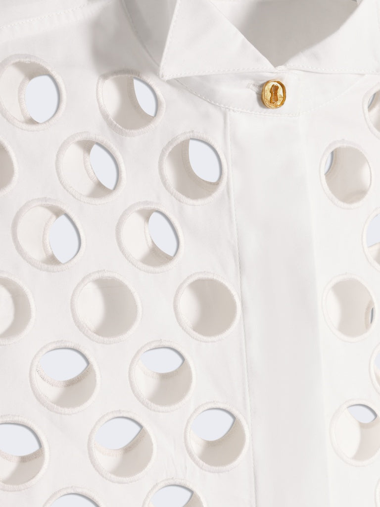 This tuxedo shirt is made from white poplin covered with broderie anglaise circles forming a polka dot pattern. It is embellished with bijoux buttons at the collar and cuffs, and cufflinks at the bottom of the sleeves. Concealed button placket at the centre front.