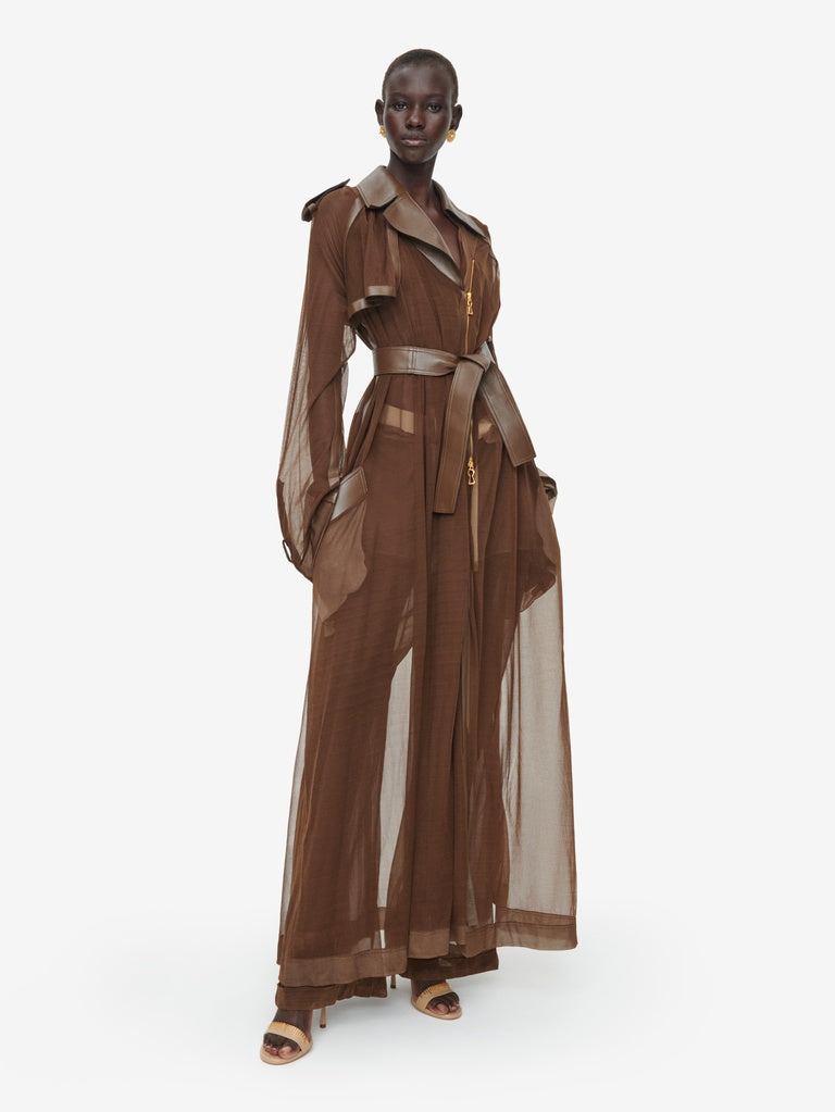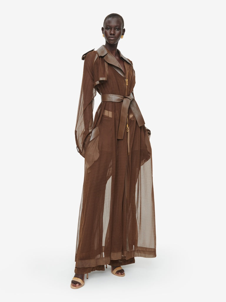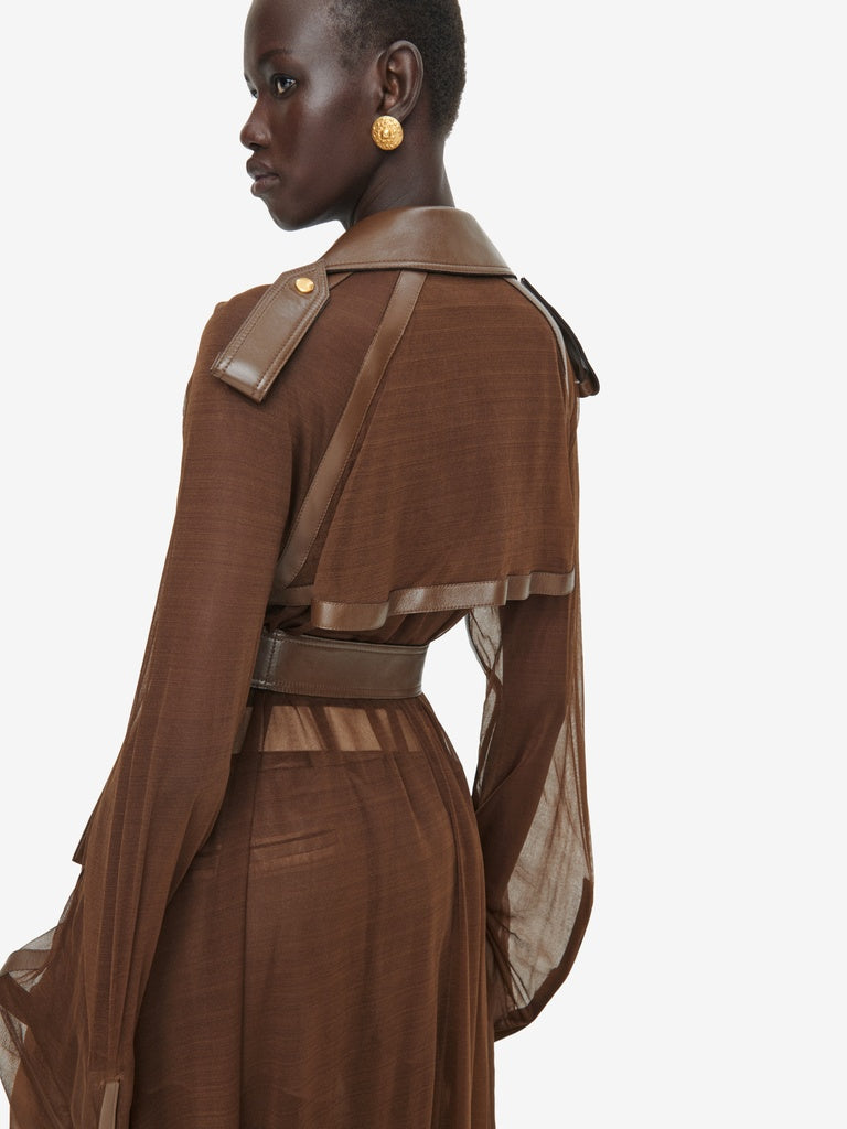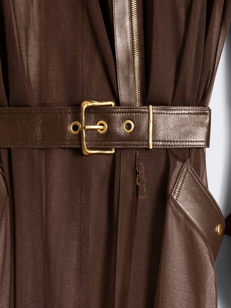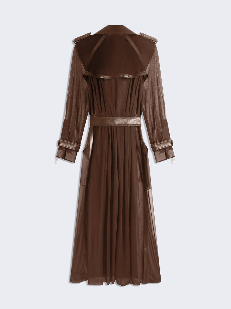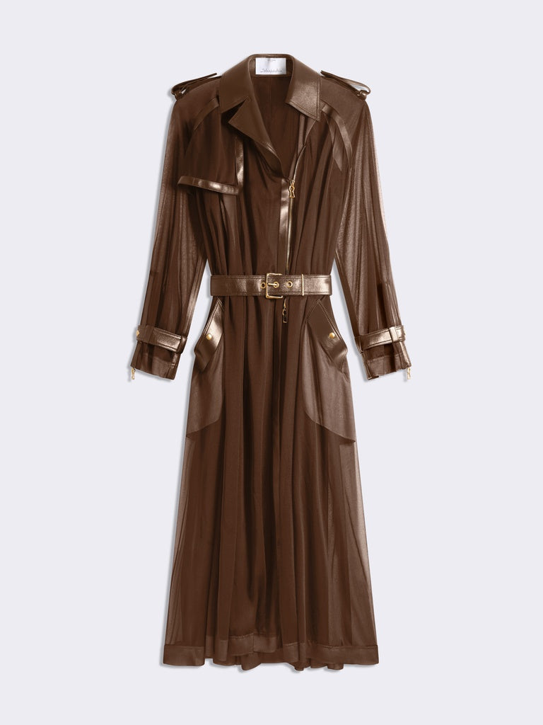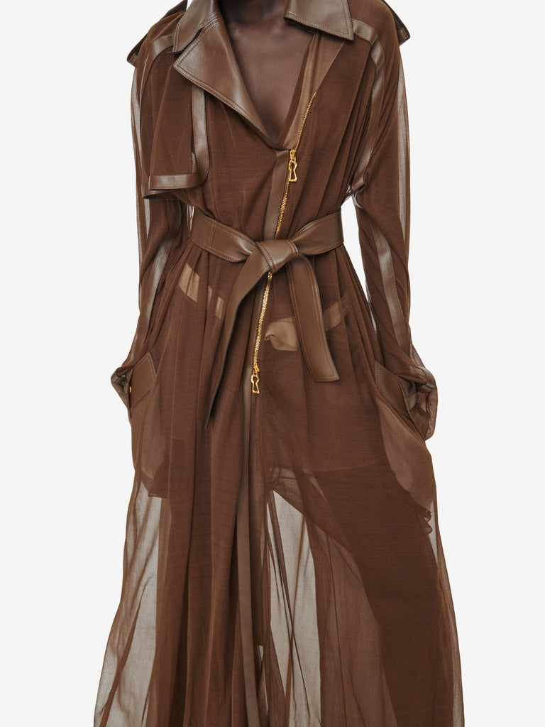 Ce trench est réalisé en jersey transparent marron agrémenté d'empiècements en cuir d'agneau ton sur ton. Il est rehaussé d'un zip en métal doré au milieu devant et aux poignets, d'une ceinture à la taille et de pressions dorées sur les poches, rabat, épaules et poignets.