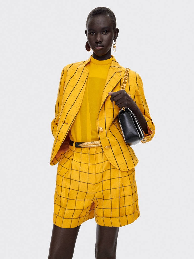 These low-rise oversized shorts are made from textured yellow linen with black checks.
