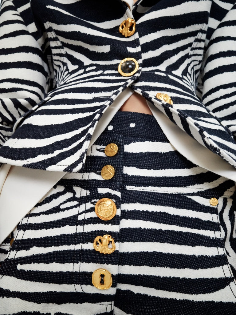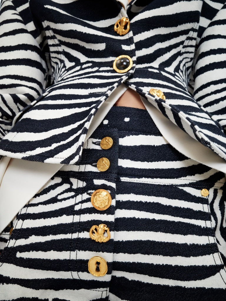 This fitted, single-breasted jacket with slightly oversized shoulders is made from ecru and black zebra-print jacquard.