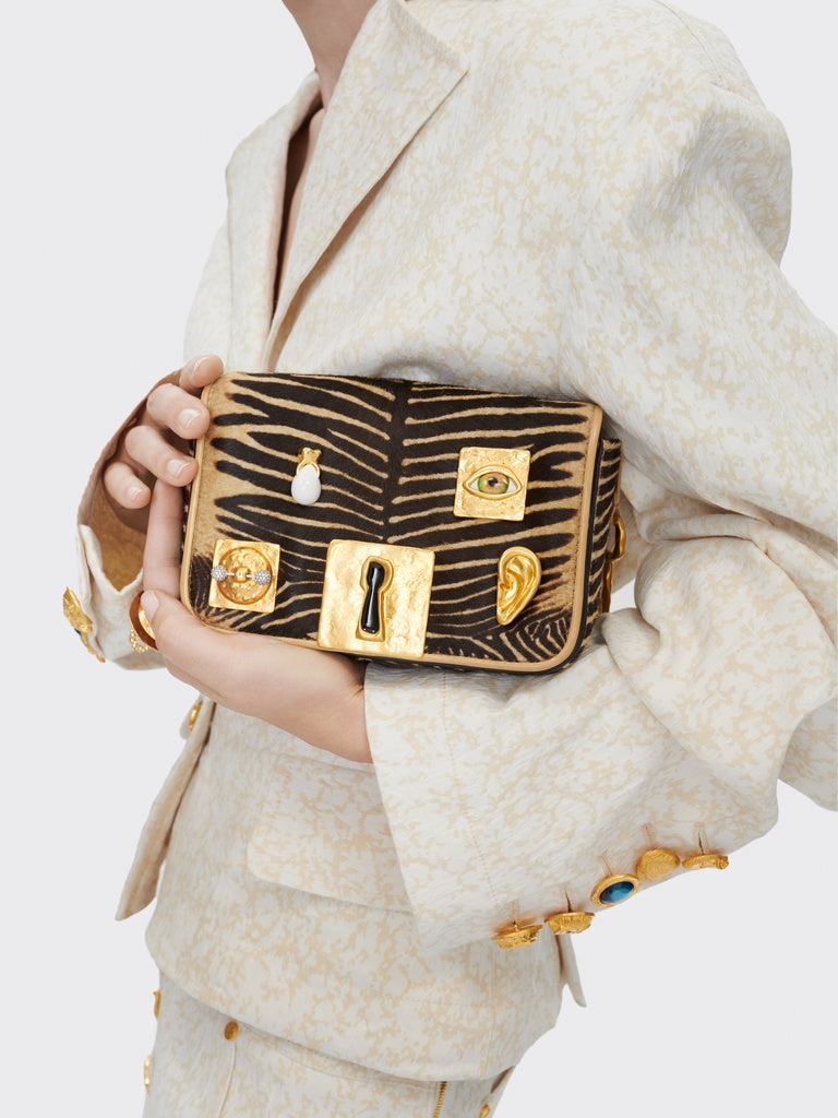 It is decorated with hammered gold brass jewel buttons on the front.