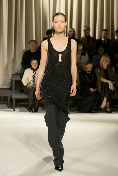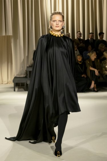 Asymmetrical dress in black velvet and crepe jersey, held together by a gold chain necklace. The left side of the dress is fully draped and enhanced by a train held in place by a gold chain.