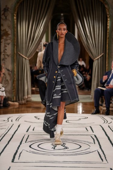 Raw Japanese denim coat with exaggerated asymmetrical shawl collar and flared cuffs. It is embellished with contrasting white topstitching and signature golden Keyhole buttons in the middle and at the bottom of the sleeves. It is paired with a denim spiral skirt used on both sides, enhanced with denim appliqués to create a textured play of relief. Golden brass bean earring adorned with cultured pearls and a rhinestone piercing. Cuff bracelet featuring an abstract “beautiful disaster” with a signature openwork Keyhole in gilded copper and rhinestones. Ecru canvas sneakers adorned with signature trompe-l’œil golden Toes.