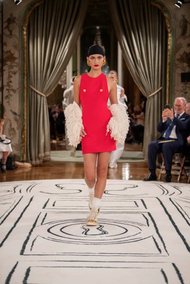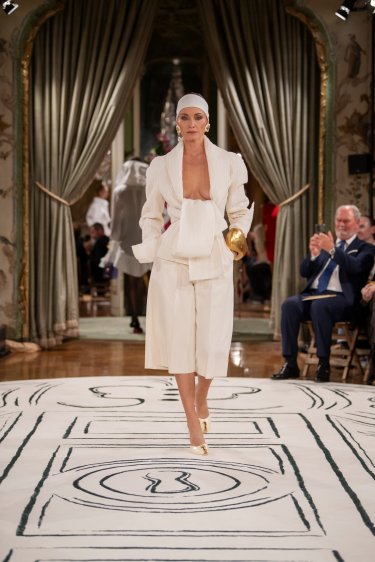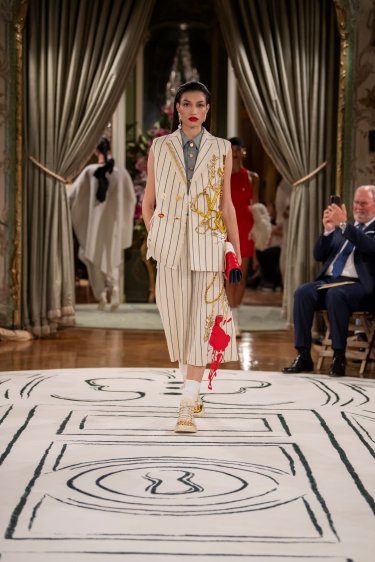 Iconic Measuring tailored jacket in a double-breasted, sleeveless version in white linen with blue stripes, embellished with fancy embroidery in sequins, leather, rhinestones etc. and bijoux-buttons in enamel and gold brass on the front. Matching bermuda shorts in white linen and blue stripes. The suit is worn over a raw denim sleeveless cardigan. Asymmetrical earrings in enamel, gilded brass and cultured pearls depicting doves, the Maison’s emblematic bird. Schiap clutch in color-block patent leather adorned with the signature Keyhole clasp in hammered golden brass. Ecru canvas sneakers adorned with signature trompe-l’œil golden Toes.