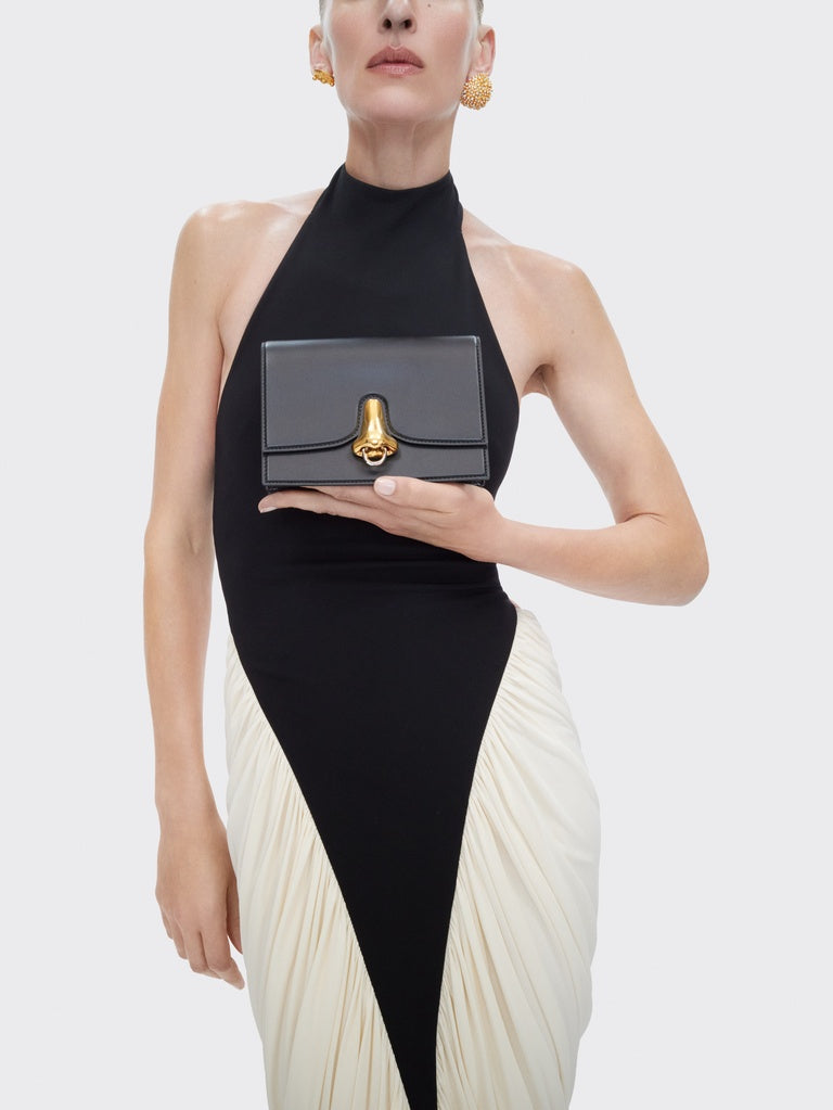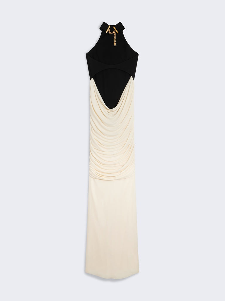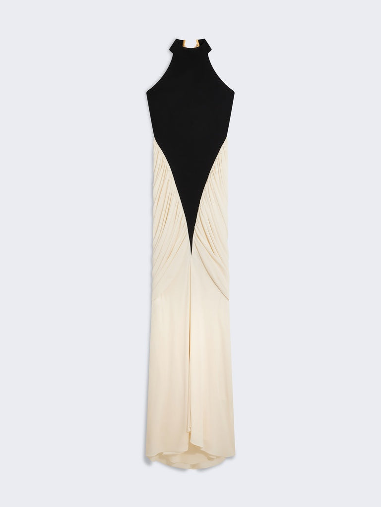 This long dress, made of black compact jersey and contrasting ecru crepe jersey, reveals the shoulders and back and cascades to the feet. It is draped in a pointed design at the bottom.